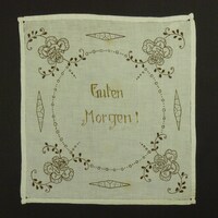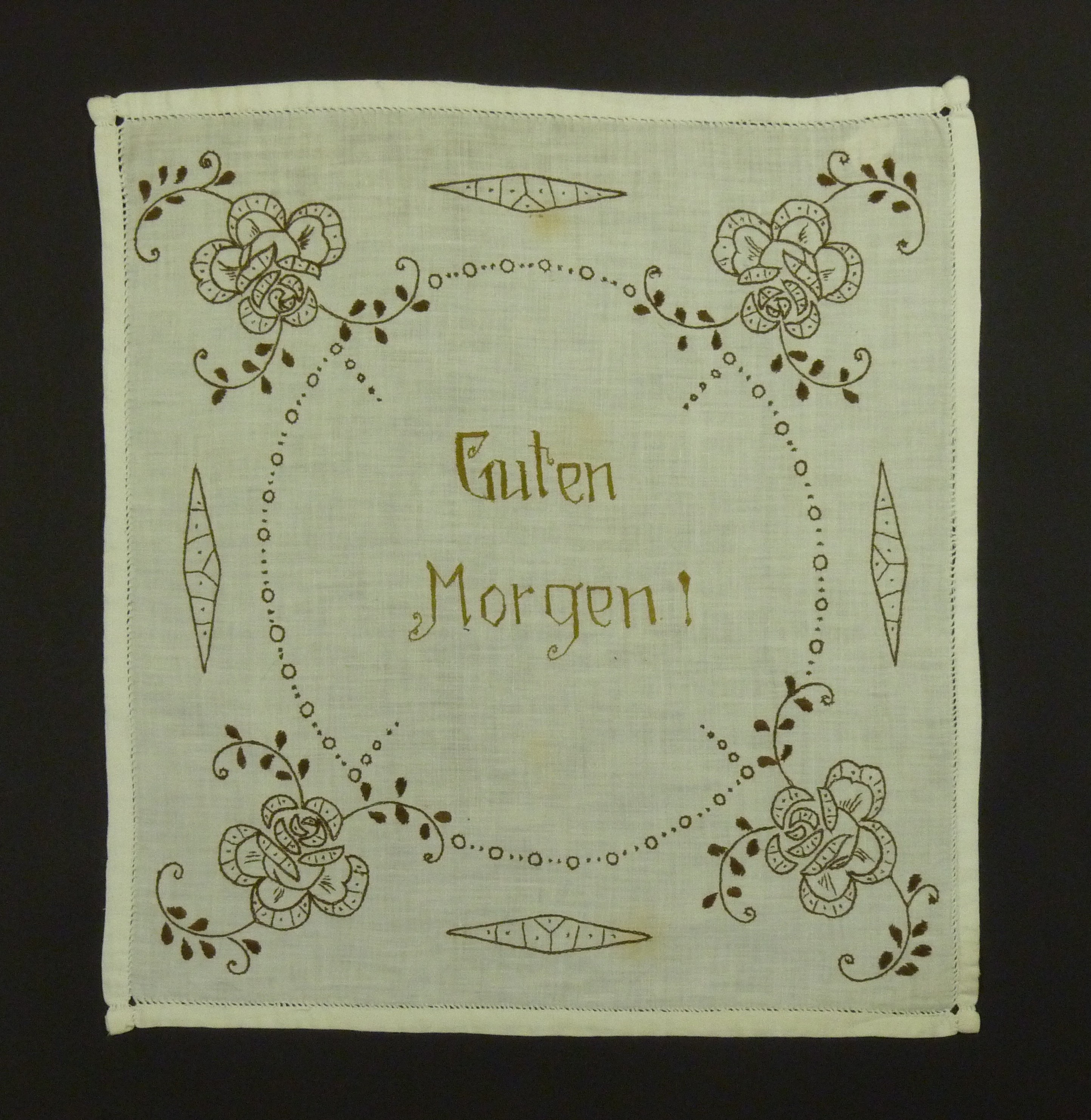 in zwei Brauntönen gestickt; in den Ecken Rosen; Hohlsaum;