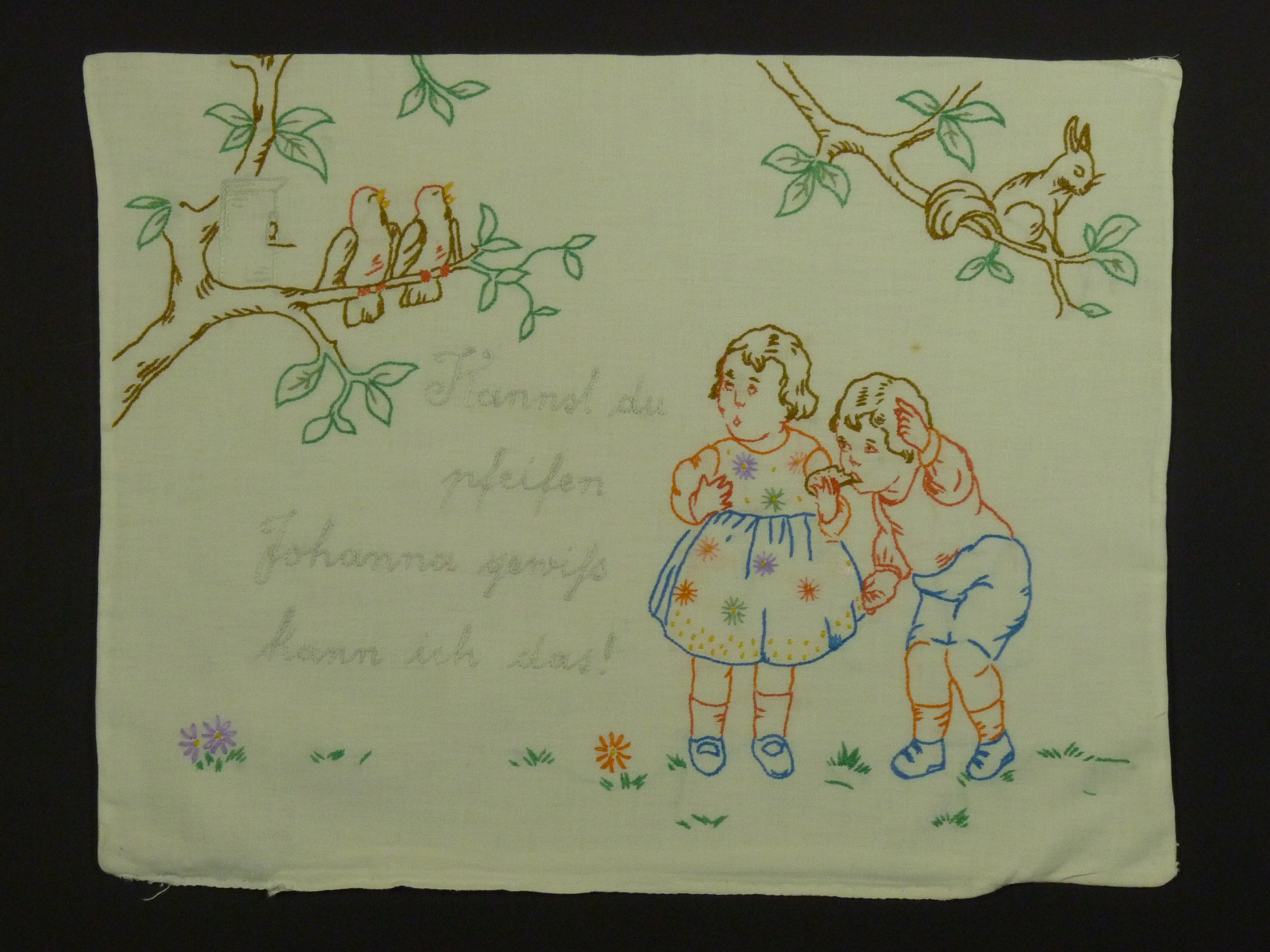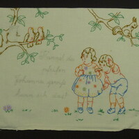 bunt bestickt; Stielstich; Mädchen und Junge, Vögel und Eichhörnchen auf einem Baum;