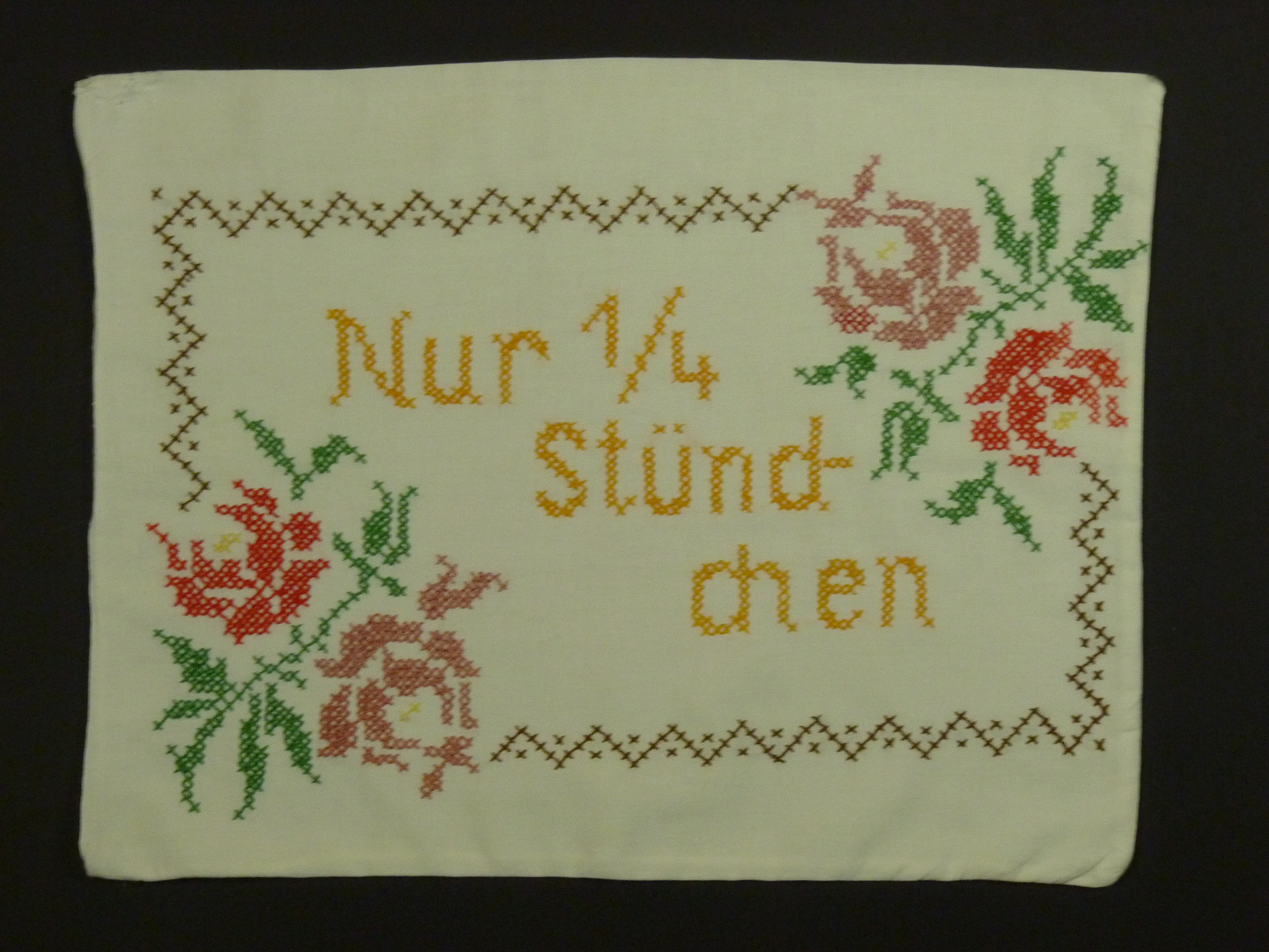in gelb, rosa, rot, grün und braun bestickt; Kreuzstich; mit Rosenmotiv;