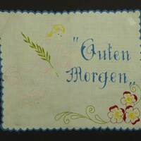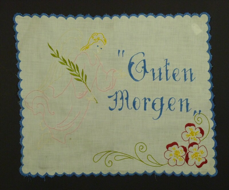 rosa, grün, weiß, gelb, blau, rot bestickt; Plattstich; mit blauen Schlingstich eingefasst; Engelmotiv und Blumenmotiv;