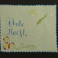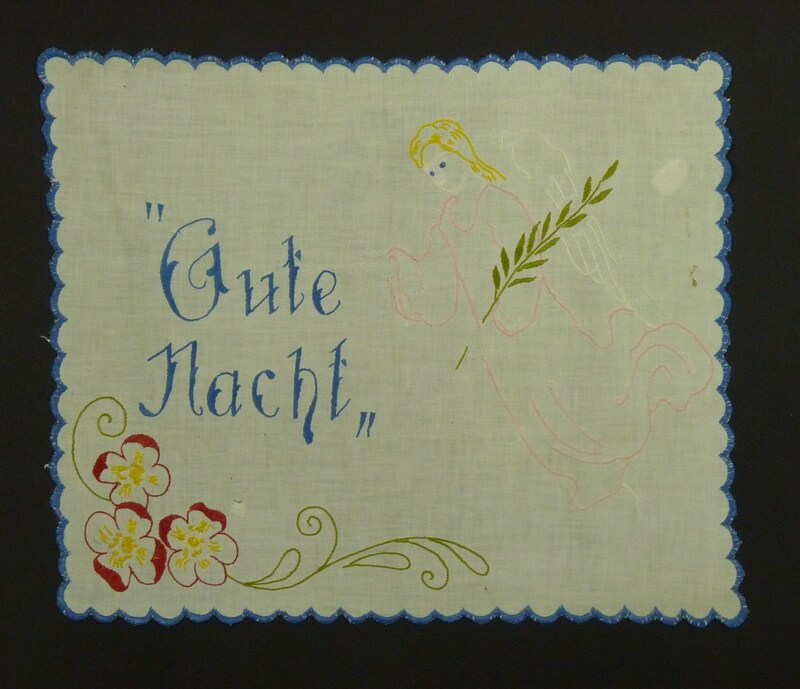 rosa, grün, weiß, gelb, blau, rot bestickt; Plattstich; mit blauen Schlingstich eingefasst; Engelmotiv und Blumenmotiv;
