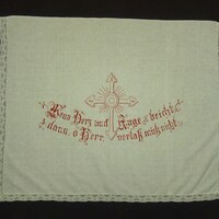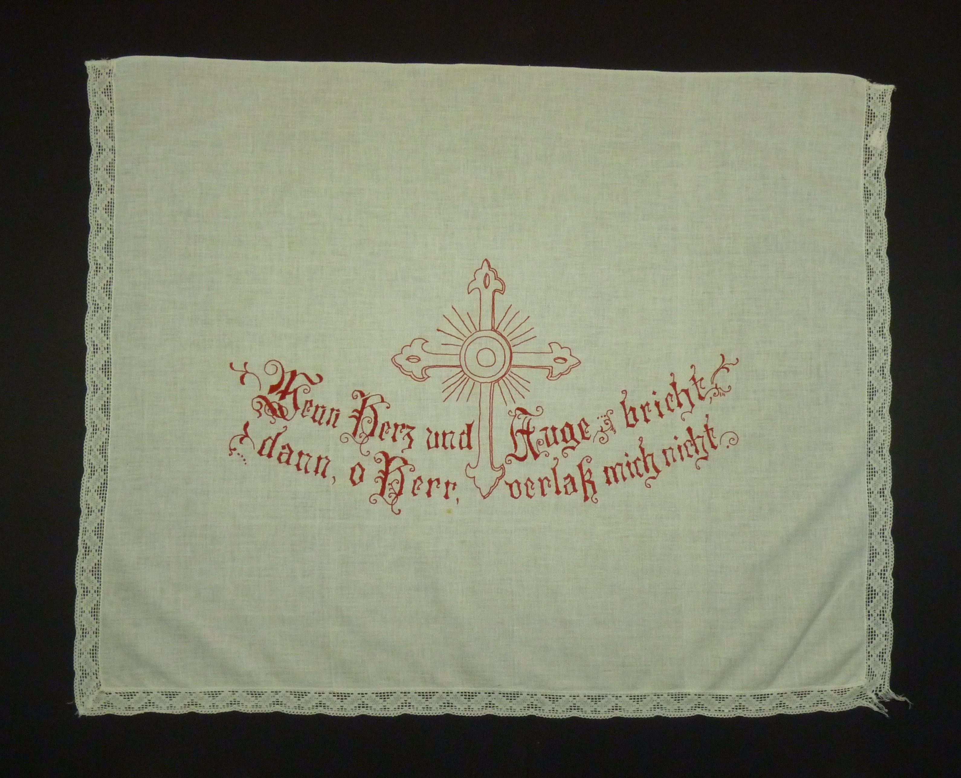 Versehtuch; mit rotem Faden bestickt; mit Spitze eingefasst – außer oben; Kreuzmotiv;