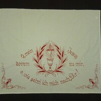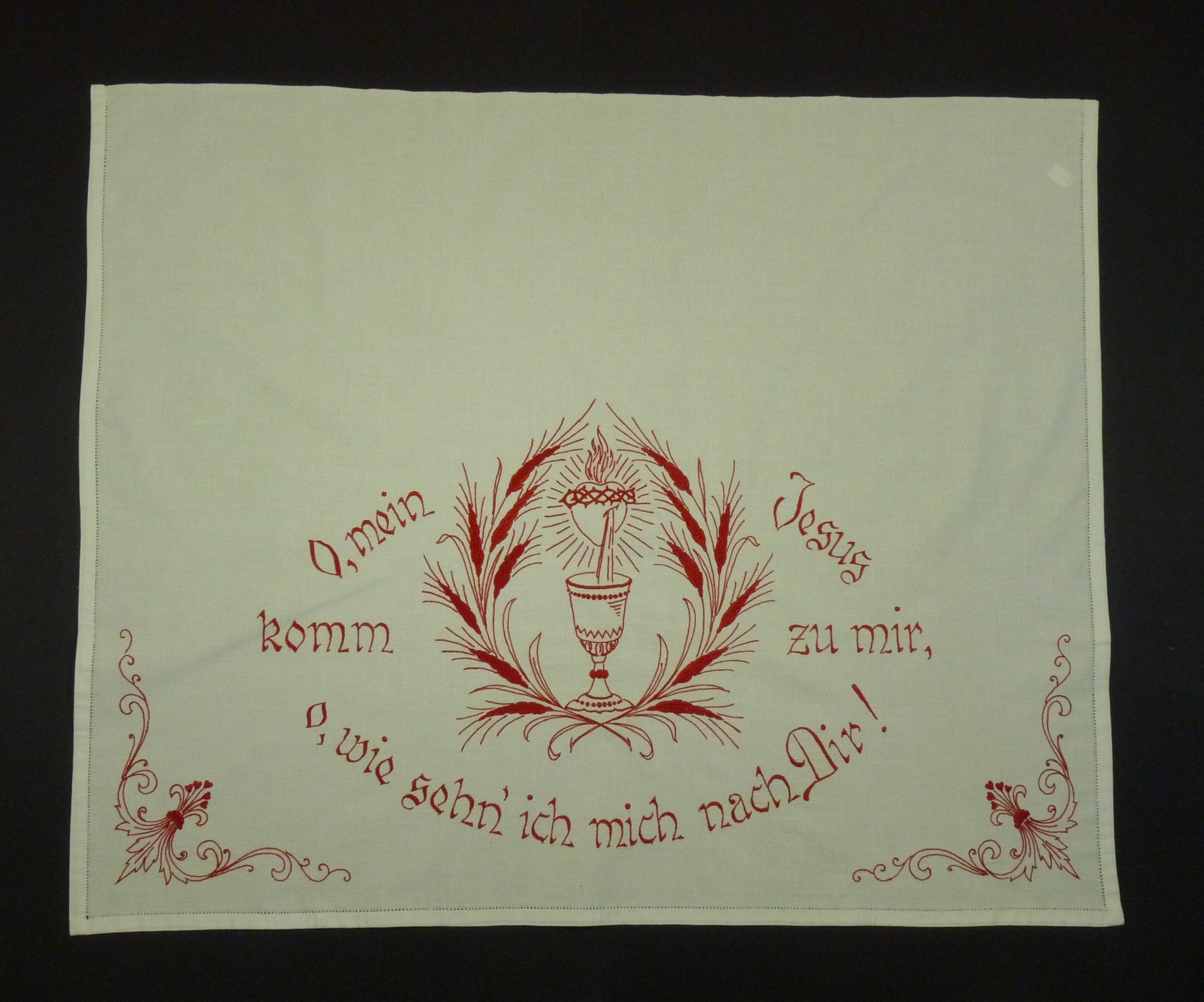 Versehtuch; rot bestickt; Hohlsaum; Kelch, Herz Jesu, Ähren;