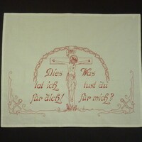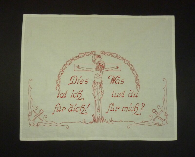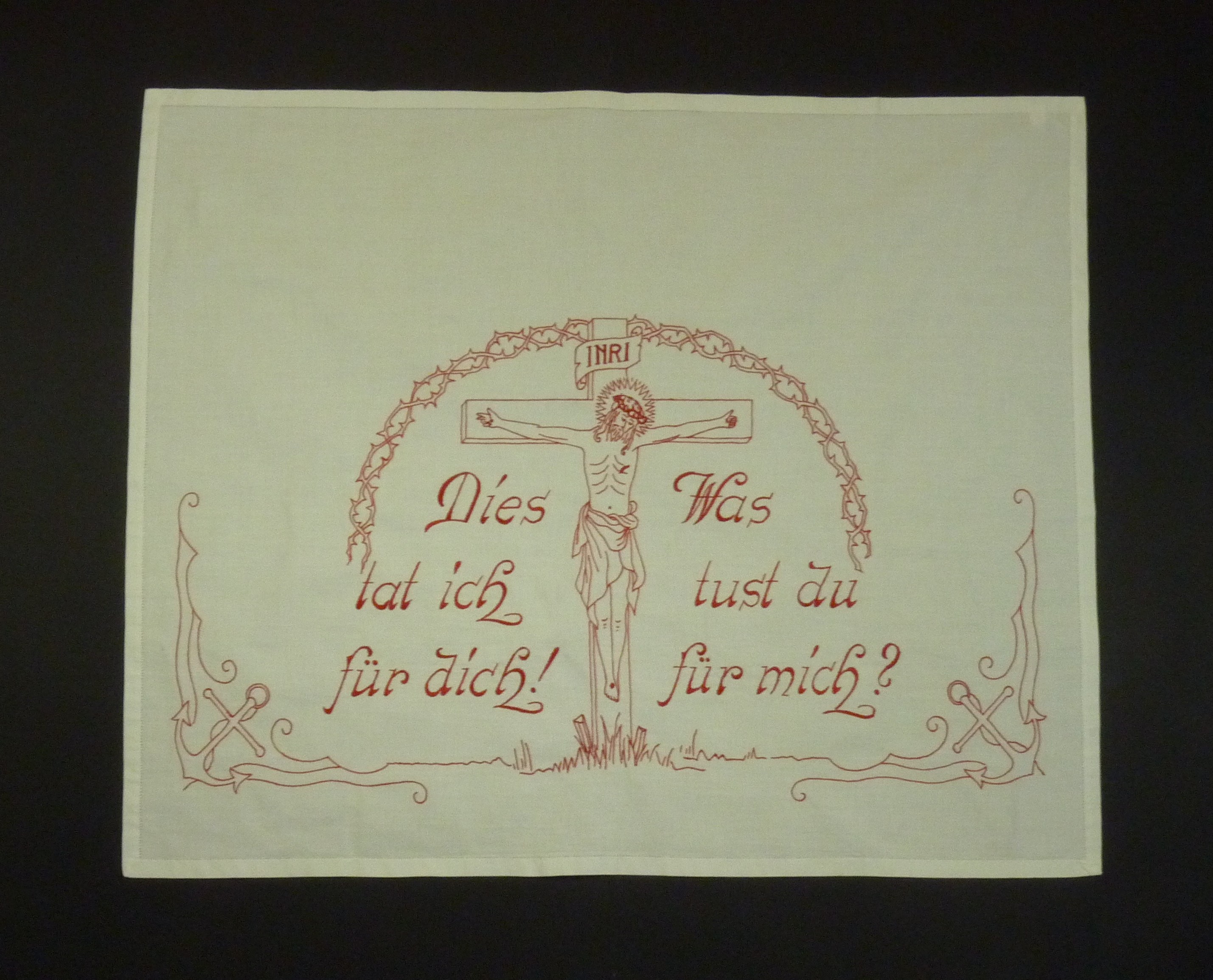 Versehtuch; rot bestickt; Hohlsaum; Jesus am Kreuz, Dornengirlande, Anker;