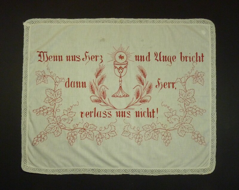 rot bestickt; mit Spitze eingefasst; Weinranken, Kelch, IHS, Ähren;