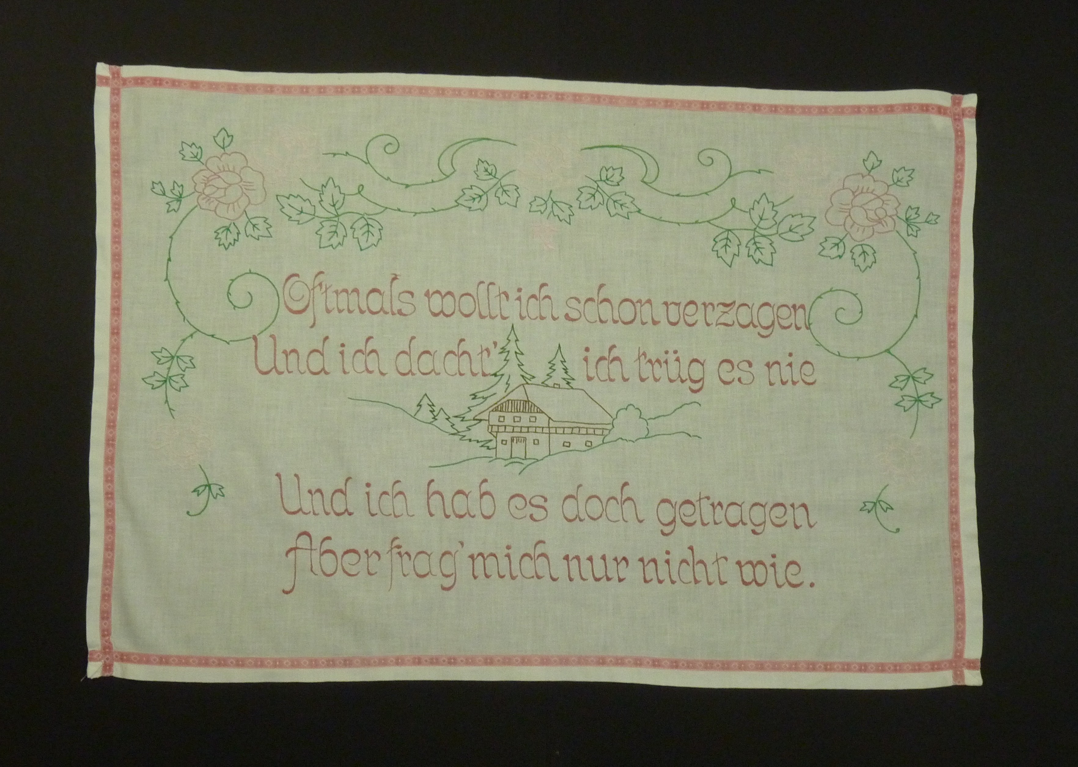 Spruch: "Oftmals wollt ich schon verzagen / Und ich dacht' ich trüg es nie / Und ich habe es doch getragen / Aber frag mich nur nicht wie." - Umfang