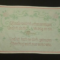 Spruch rot gestickt;, Blumenranken in grün und pink; mit einem Zierband umrandet;