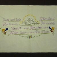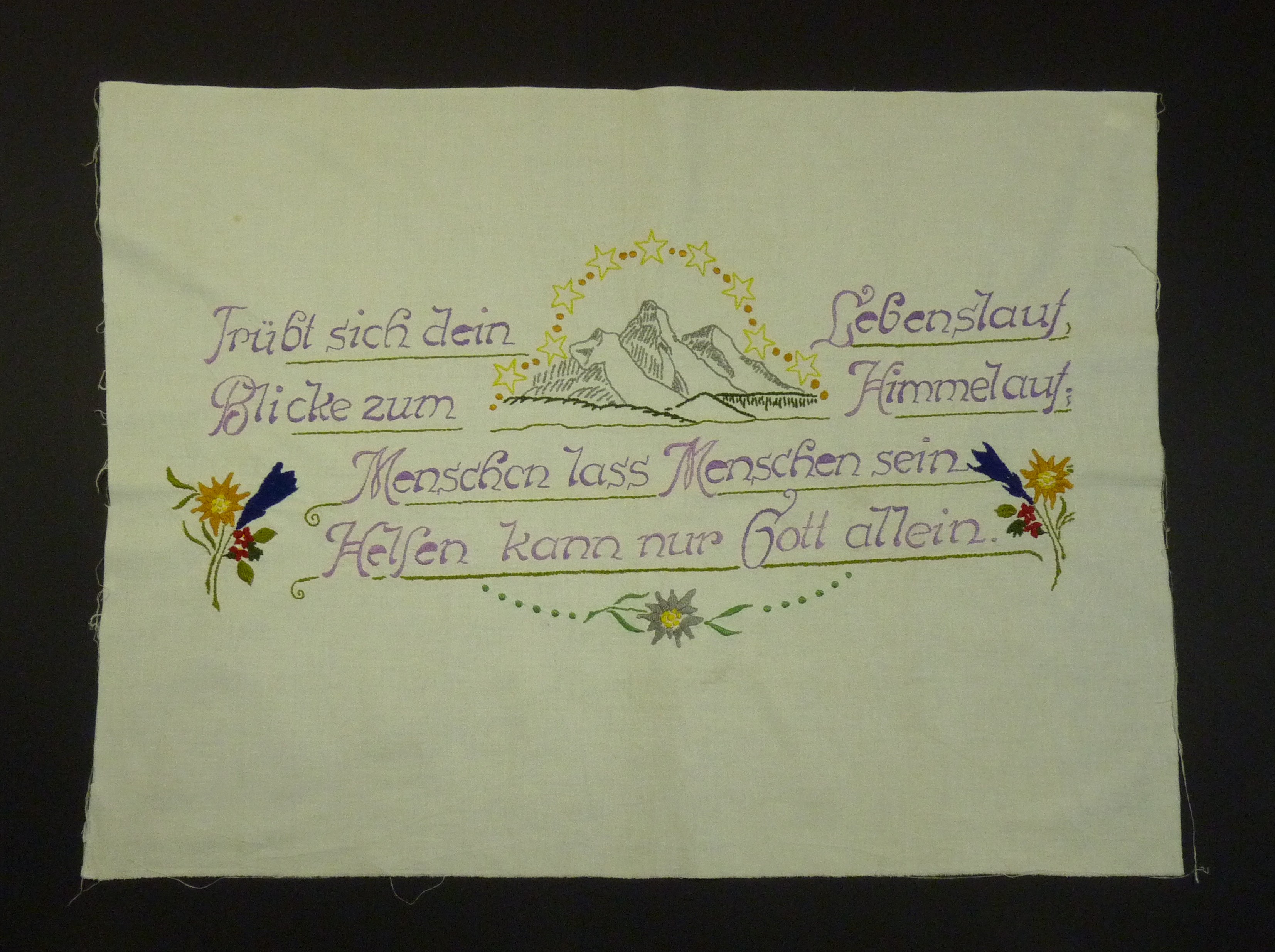Spruch mit lila Faden gestickt; ohne Saum; Motiv: Berglandschaft mit Sternen, Edelweiss, Enzian;