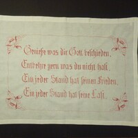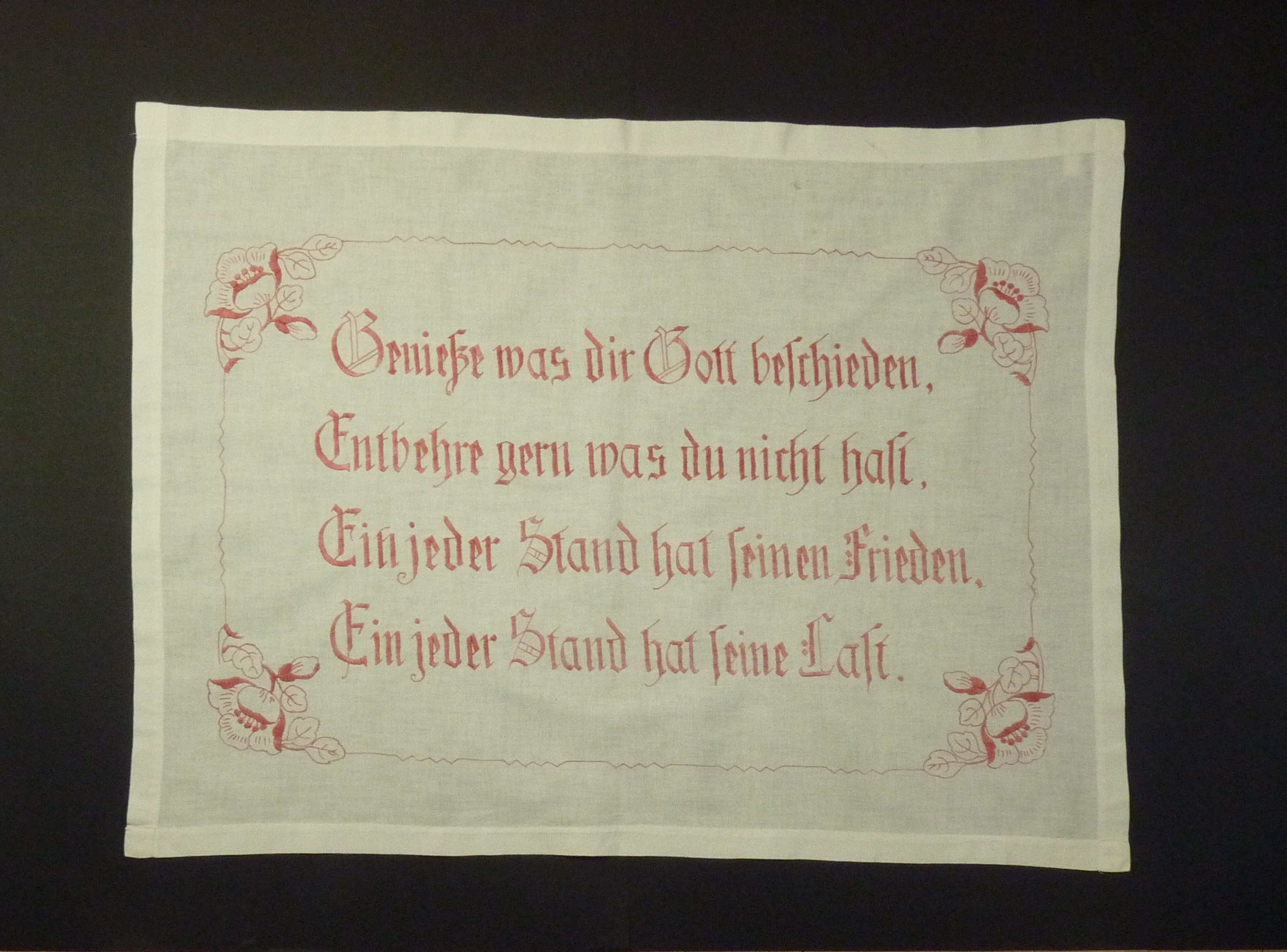 Spruch: "Genieße was dir Gott beschieden, / Entbehre gern was du nicht hast, / Ein jeder Stand hat seinen Frieden, / Ein jeder Stand hat seine Last." - Umfang