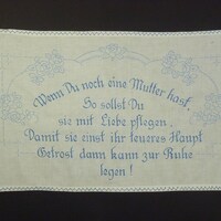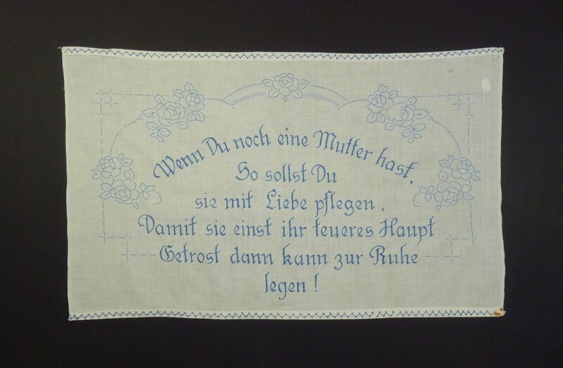 Spruch: "Wenn Du noch eine Mutter hast, / So sollst Du / sie mit Liebe pflegen, / Damit sie einst ihr teueres Haupt / Getrost dann kann zur Ruhe / legen!" - Umfang