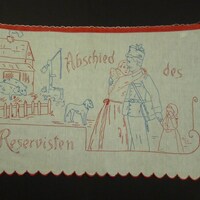 rot, blau bestickt; linker, rechter und unterer Rand bogenförmig eingefasst mit Schlingstich, oberer Rand mit rotem Band eingefasst und rosaroter Luftmaschenkette zum Aufhängen; Motiv: Frau umarmt Mann, kleines Mädchen weint, Bauernhof, zwei Schweine, ein Lamm, Brunnen;