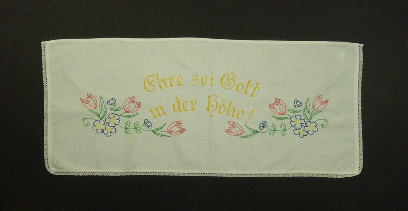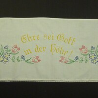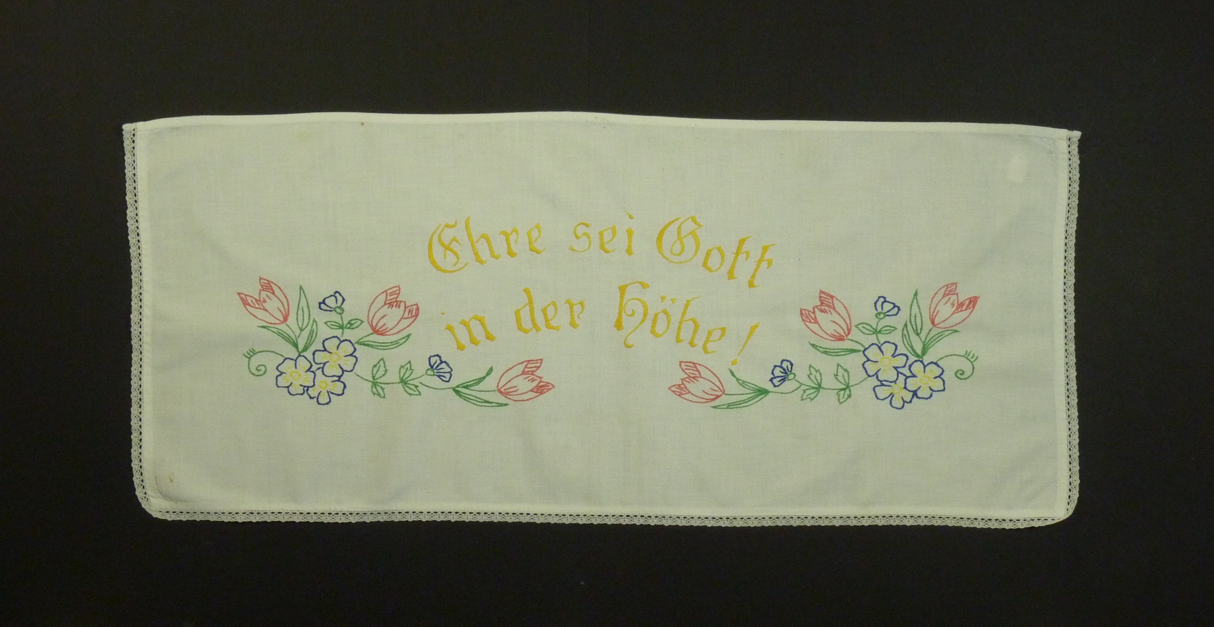 Religiöses Spruchtuch; rot, gelb, grün, blau bestickt; links, rechts und unten mit Spitze eingefasst; Motiv: Blumen;