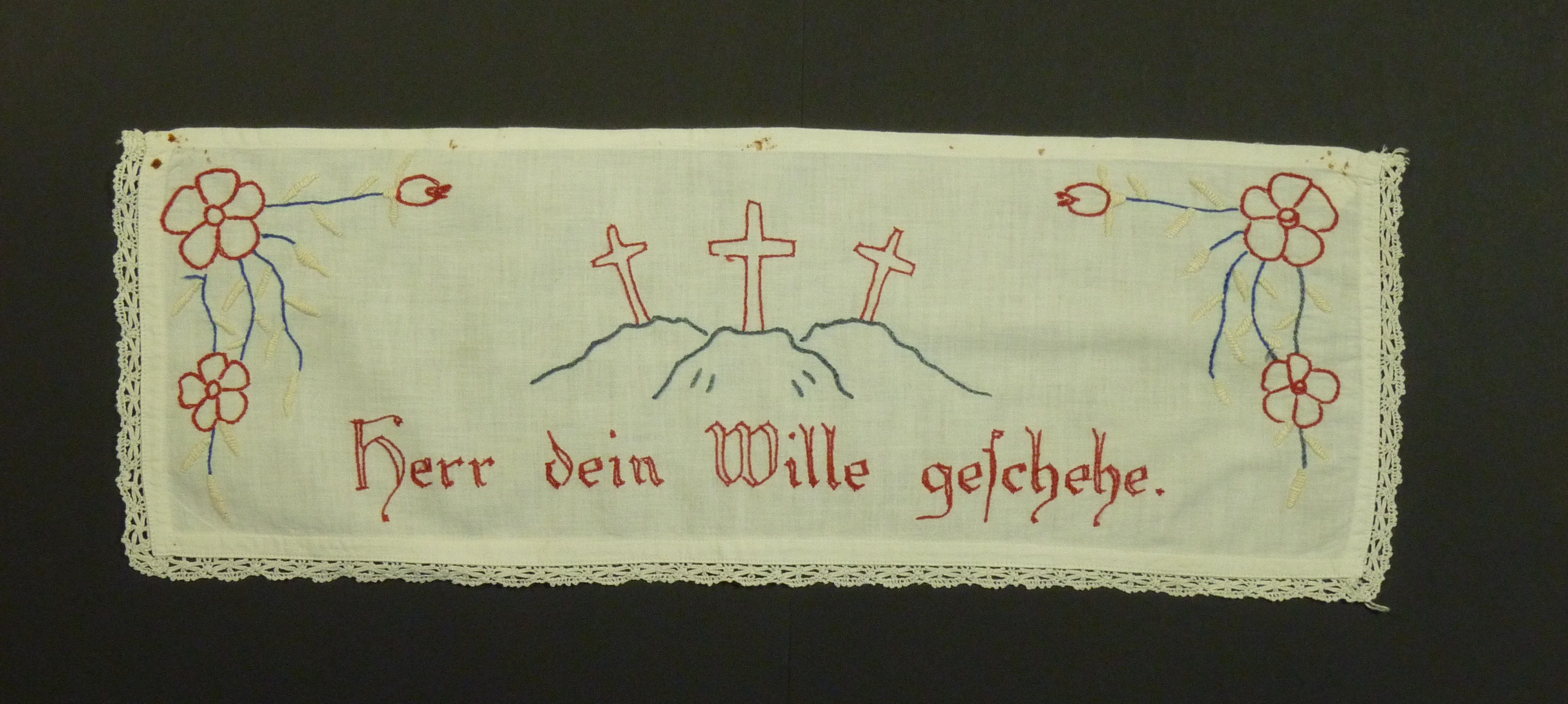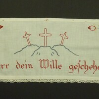 1-teiliges Spruchband- religiös; in blau, rot und weiß bestickt; rechts, links und unten Spitze; Motiv: drei Kreuze auf drei Hügeln, Blumen;