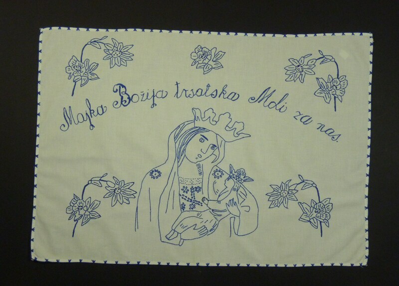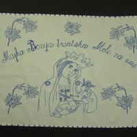 blau bestickt; Blatt- und Stielstich; mit gehäkelter Einfassung; Motiv: Muttergottes mit Blumen, Kind und Krone;