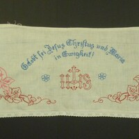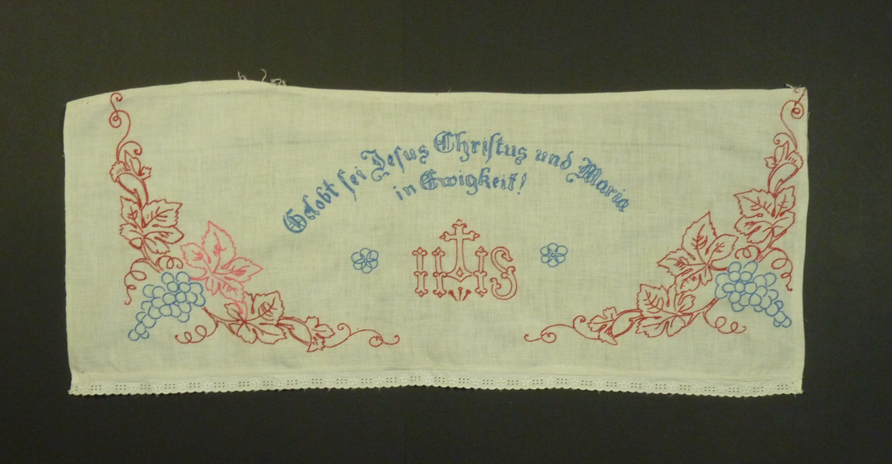 blau, rot und pink bestickt; unterer Rand mit Textilspitze; Motiv: Weintraubengirlande;