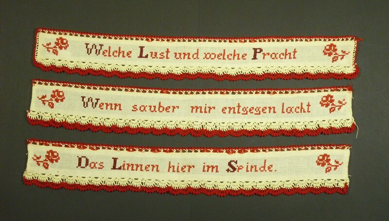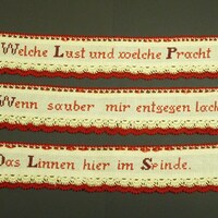 dreiteiliges Spruchband; mit zwei verschiedenen Rottönen bestickt; Kreuzstich; oben und unten mit Häkelspitze; oben zusätzlich eingeflochtenes Samtband; rechts und links Rosenmotiv;