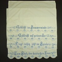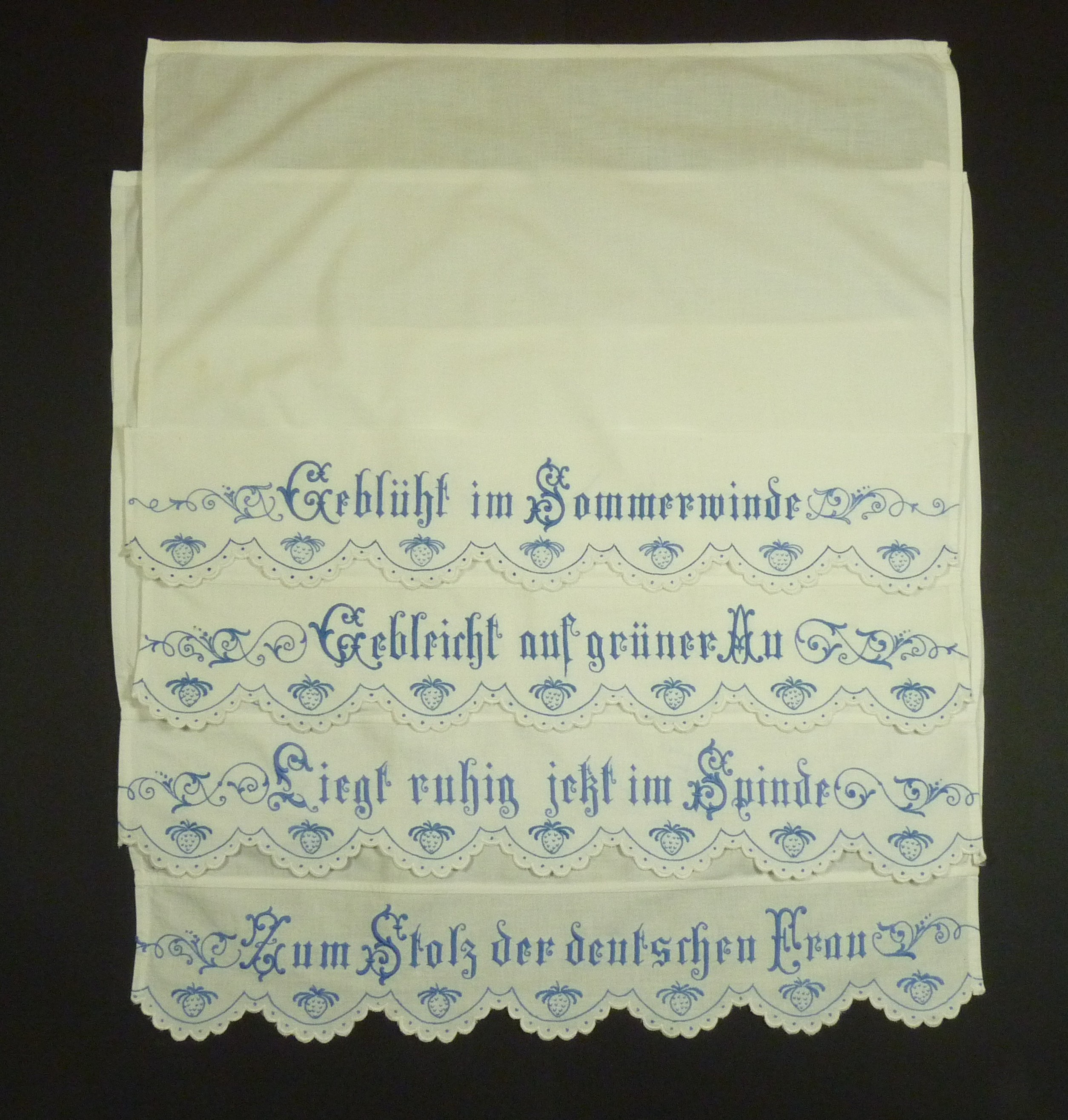 drei der vier Spruchbänder sind an mit Hohlsaum eingefasste Stoffrechtecke angenäht; blau gestickt; untere Kante Rundbögen mit Schlingstich eingefasst;