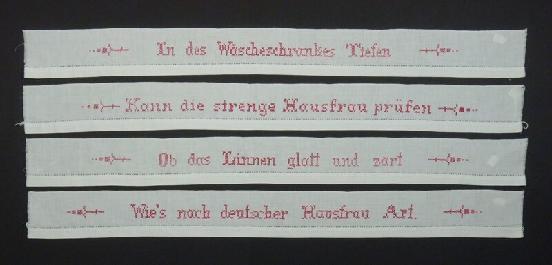 Spruch: "In des Wäscheschrankes Tiefen / Kann die strenge Hausfrau prüfen / Ob das Linnen glatt und zart / Wie's nach deutscher Hausfrau Art. /" - Umfang