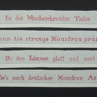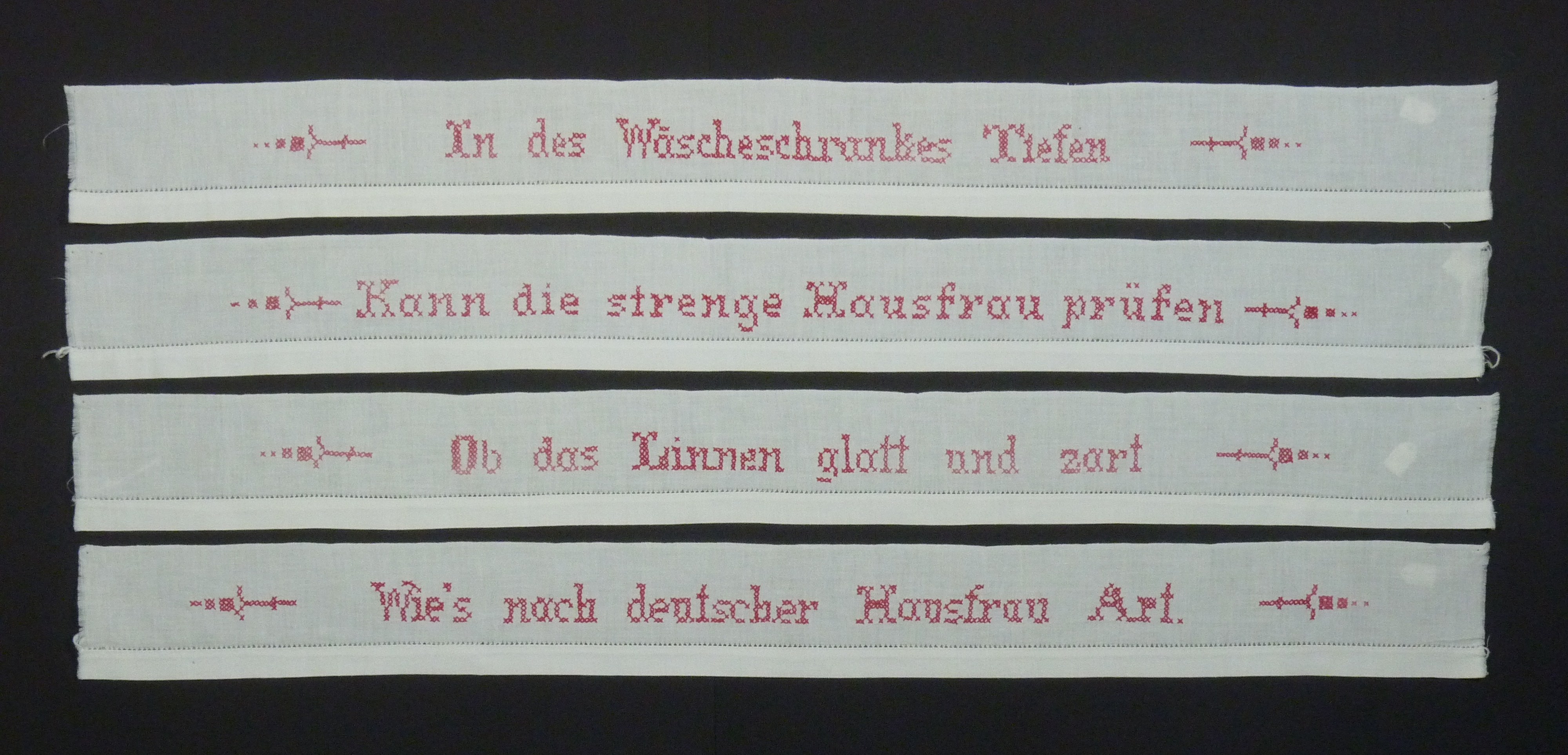 3-teiliges Spruchband; rot bestickt; Kreuzstich; unterer Rand mit feinem Hohlsaum;