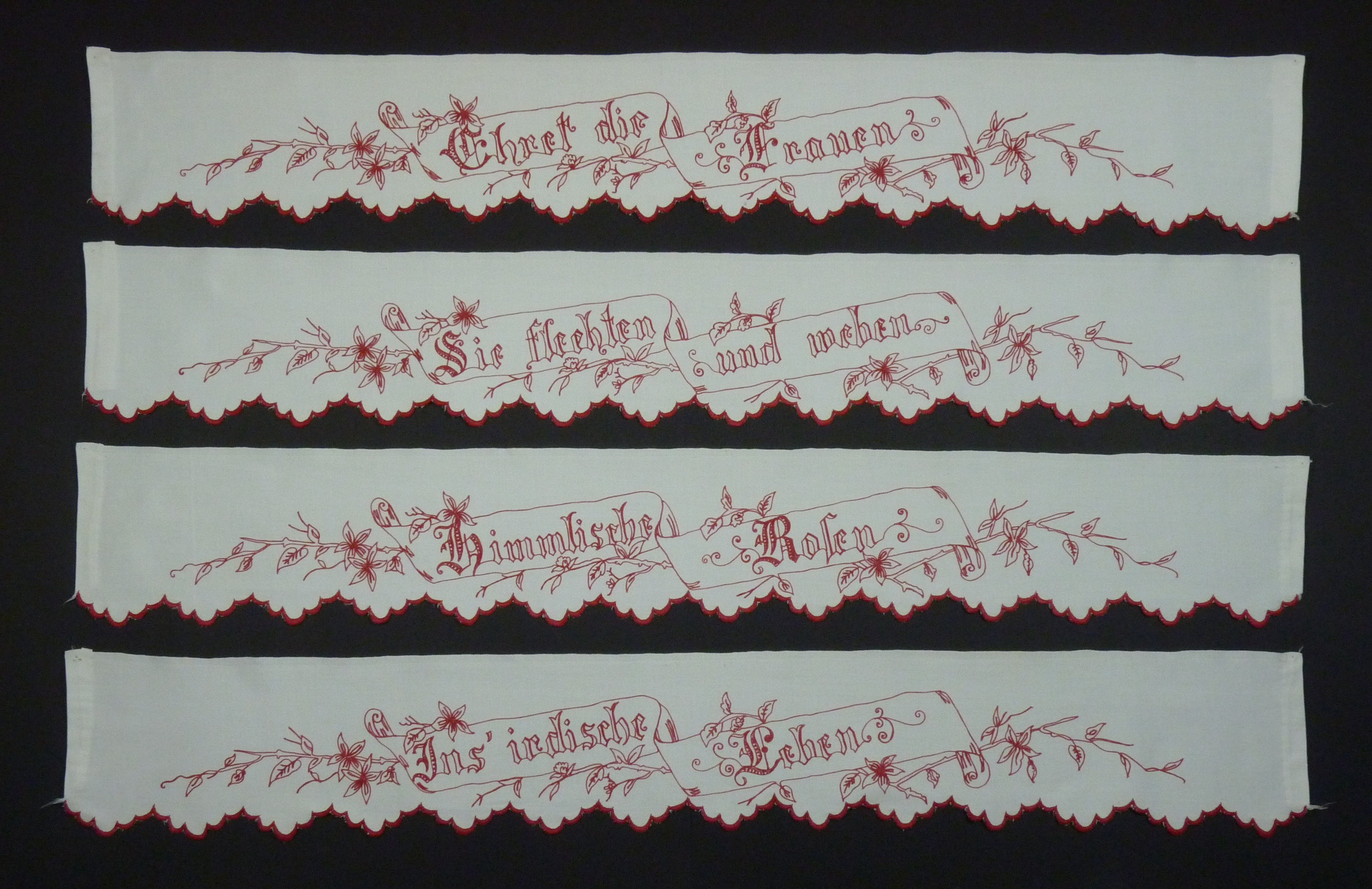 4 teiliges Spruchband; rot bestickt; maschinell; Abschluss bogenartig - mit Schlingstich eingefasst;