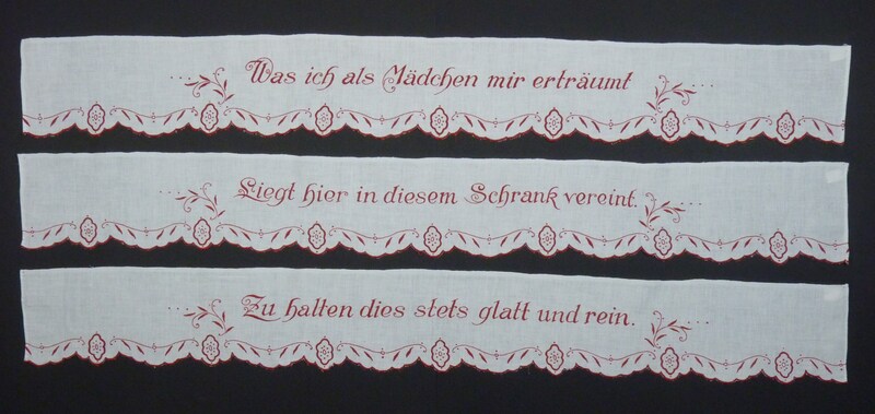 Spruch: "Zu halten dies stets glatt und rein. / Was ich als Mädchen mir erträumt / Liegt hier in diesem Schrank vereint." - Umfang
