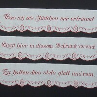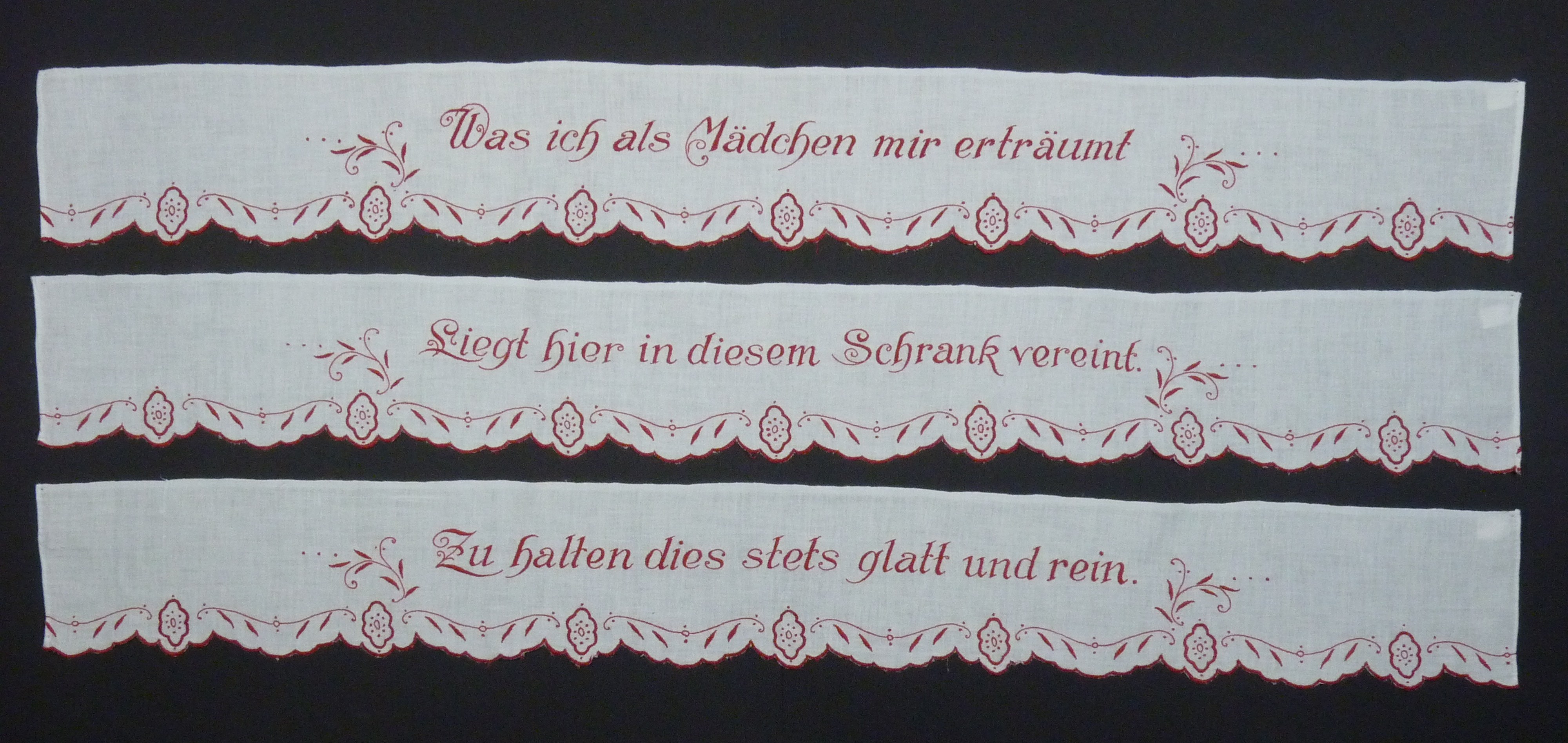 3 teiliges Spruchband; rot bestickt; unterer Saum mit Rundungen - mit Schlingstich eingefasst; wahrscheinlich fehlt ein Band und es wären zwei Sprüche;