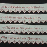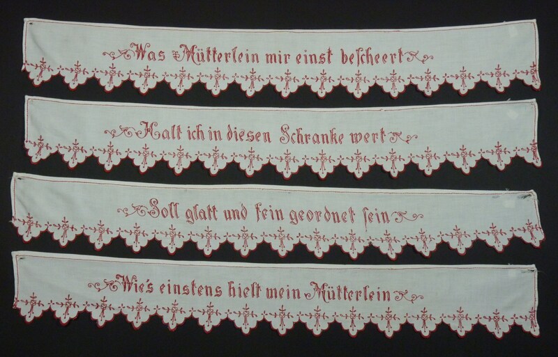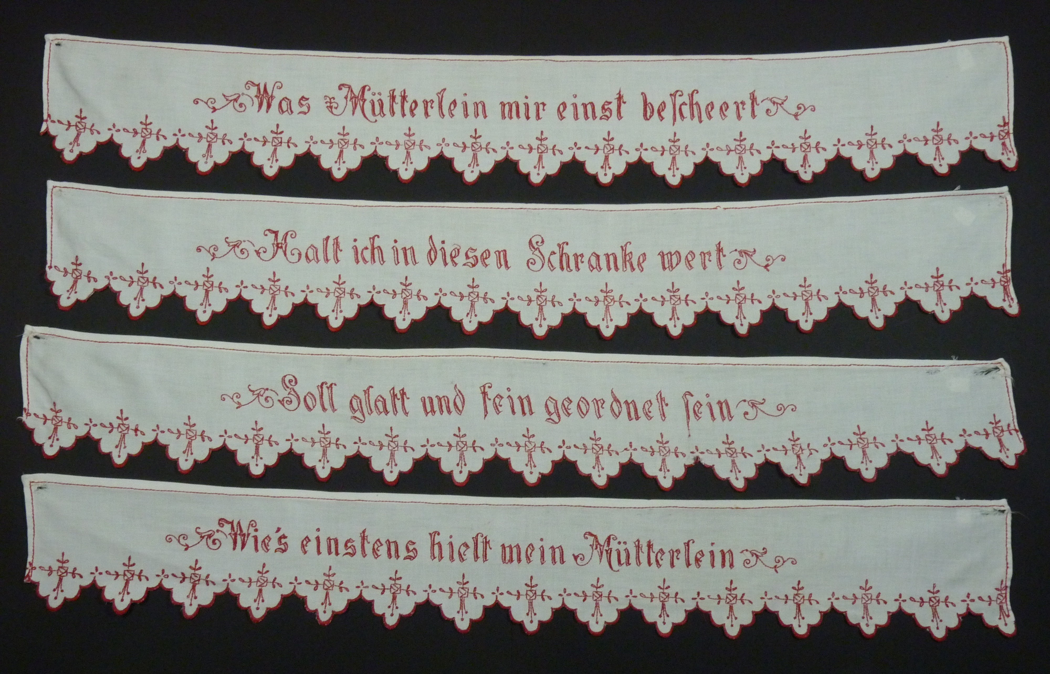 Spruch: "Was Mütterlein mir einst bescheert / Halt ich in diesen Schranke wert / Soll glatt und fein geordnet sein / Wie's einstens hielt mein Mütterlein"
