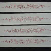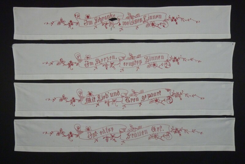 4-teiliges Spruchband; rot bestickt; Hohlsaum; Motiv: Spruch in einem Band, Blumengirlande;
