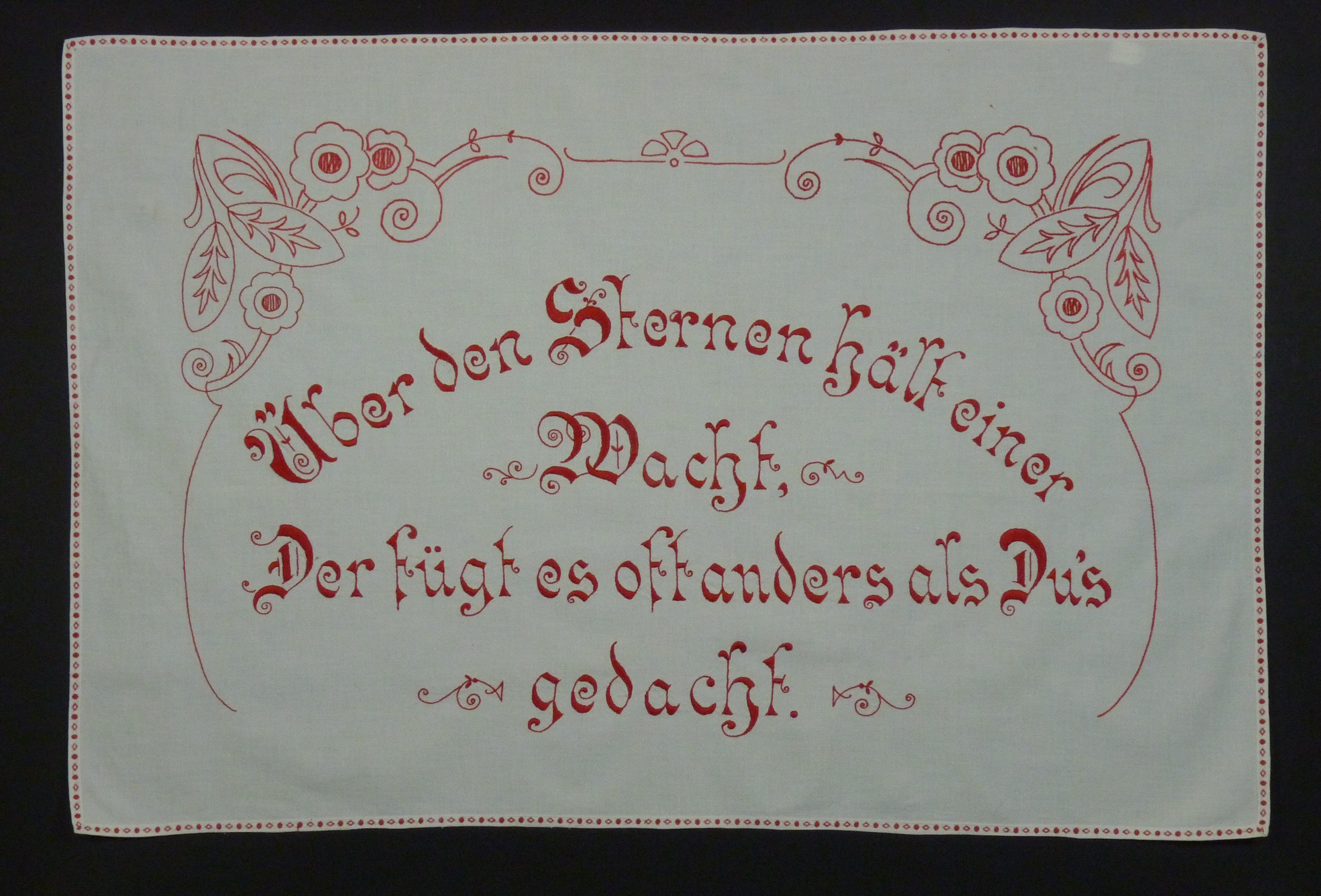 rot bestickt; mit Zierband eingefasst; Blumenornamente;