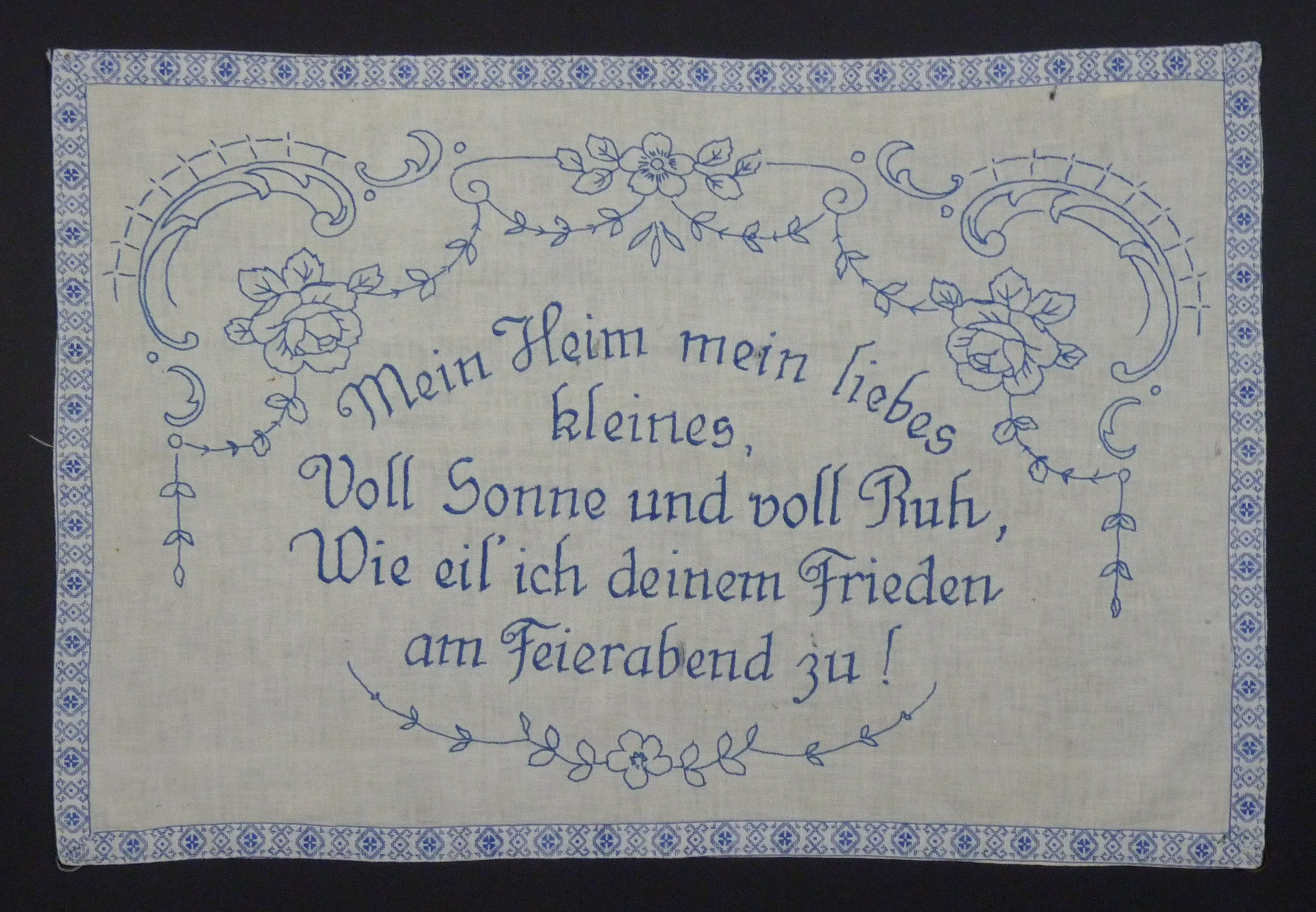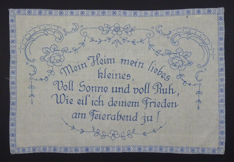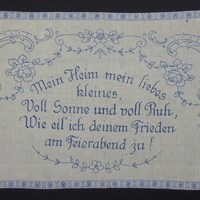 Spruch:"Mein Heim mein liebes / kleines, / Voll Sonne und voll Ruh, / Wie eil' ich deinem Frieden / am Feierabend zu!" - Umfang
