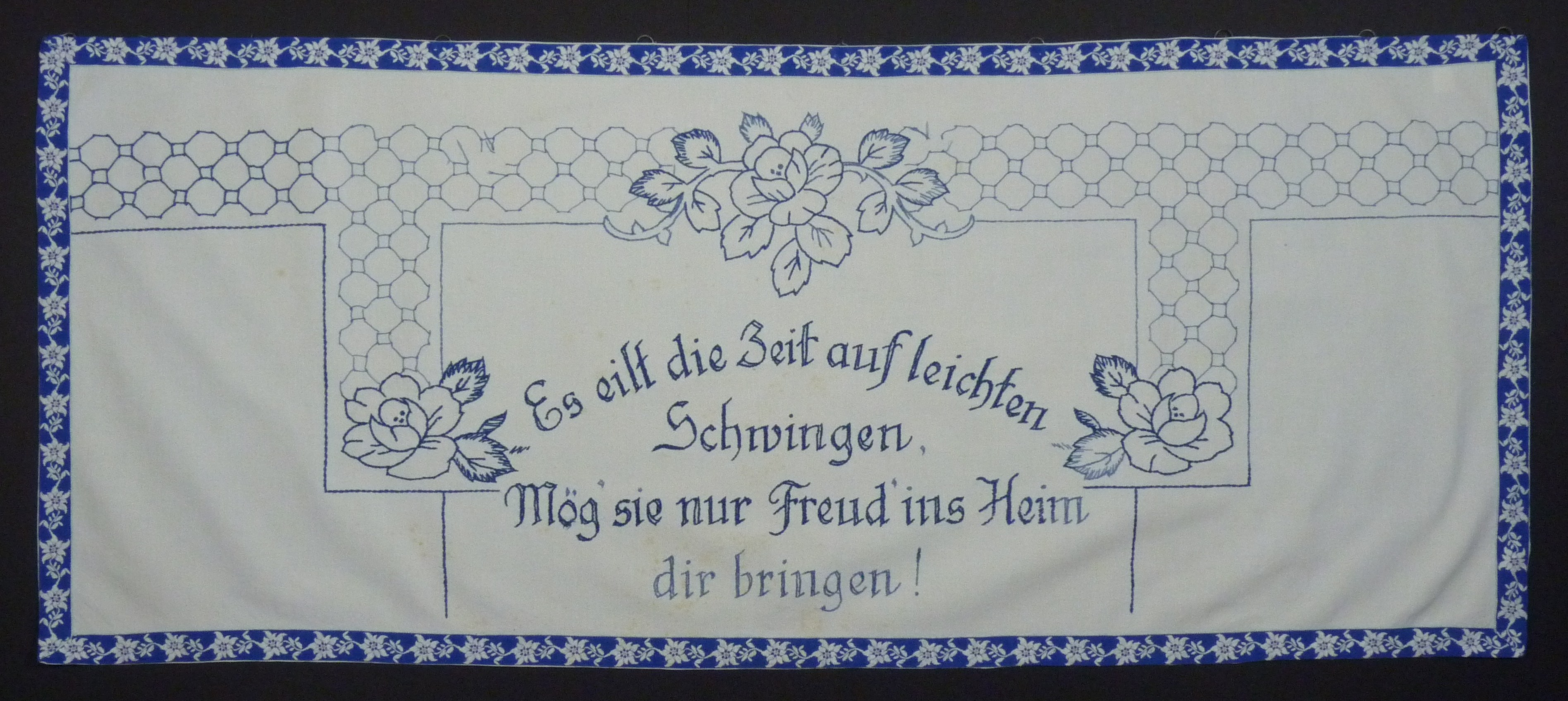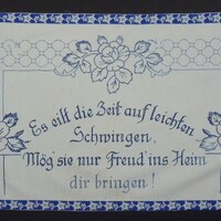 blau bestickt; mit blauer Schmuckbordüre; Motiv: Blumenornamente;