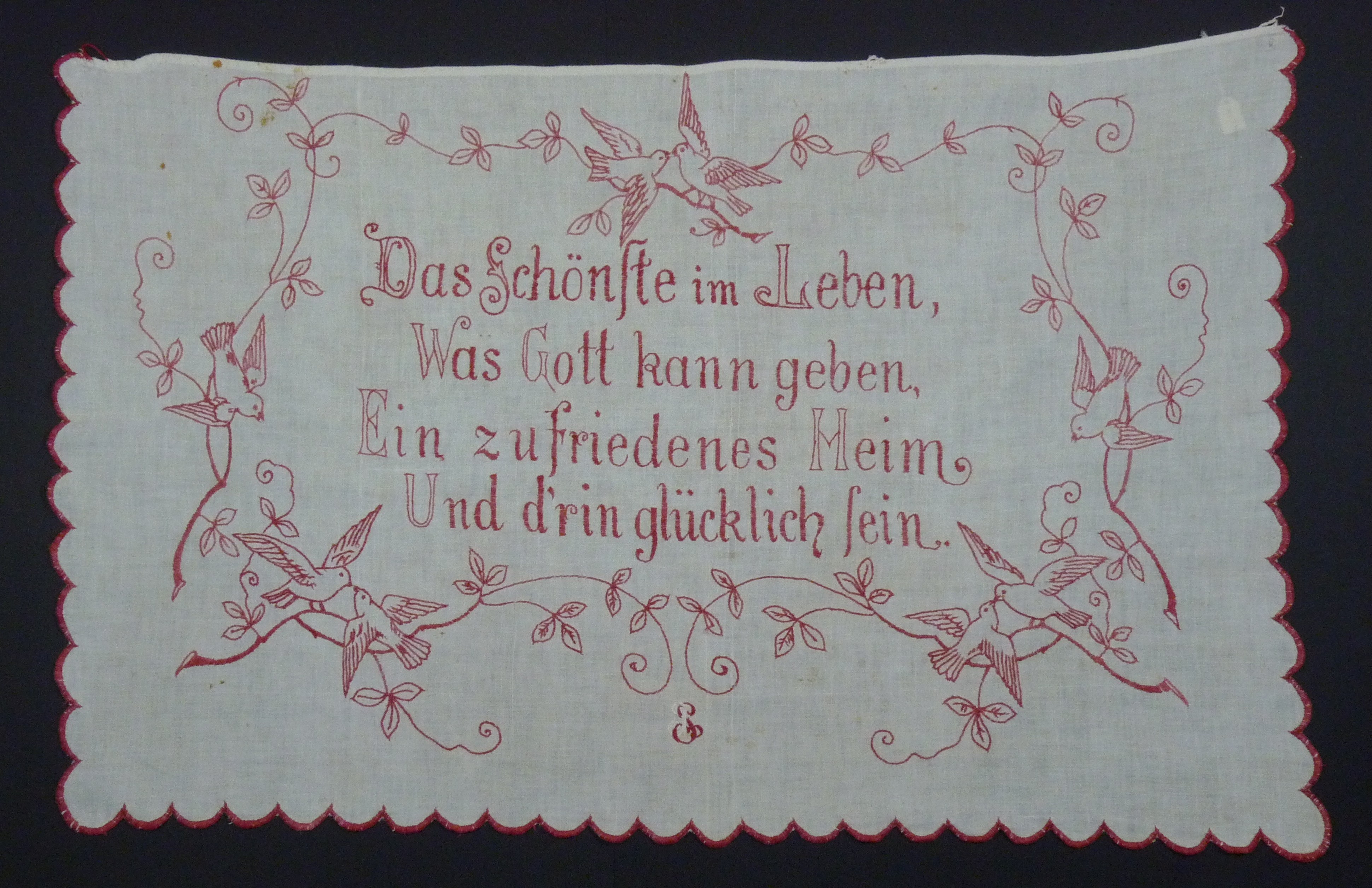 rot bestickt; linker, rechter und unterer Rand bogenförmig, eingefasst mit Schlingstich; oberer Rand drei Schlaufen zum Aufhängen; Motiv: Vögel und Blätter;