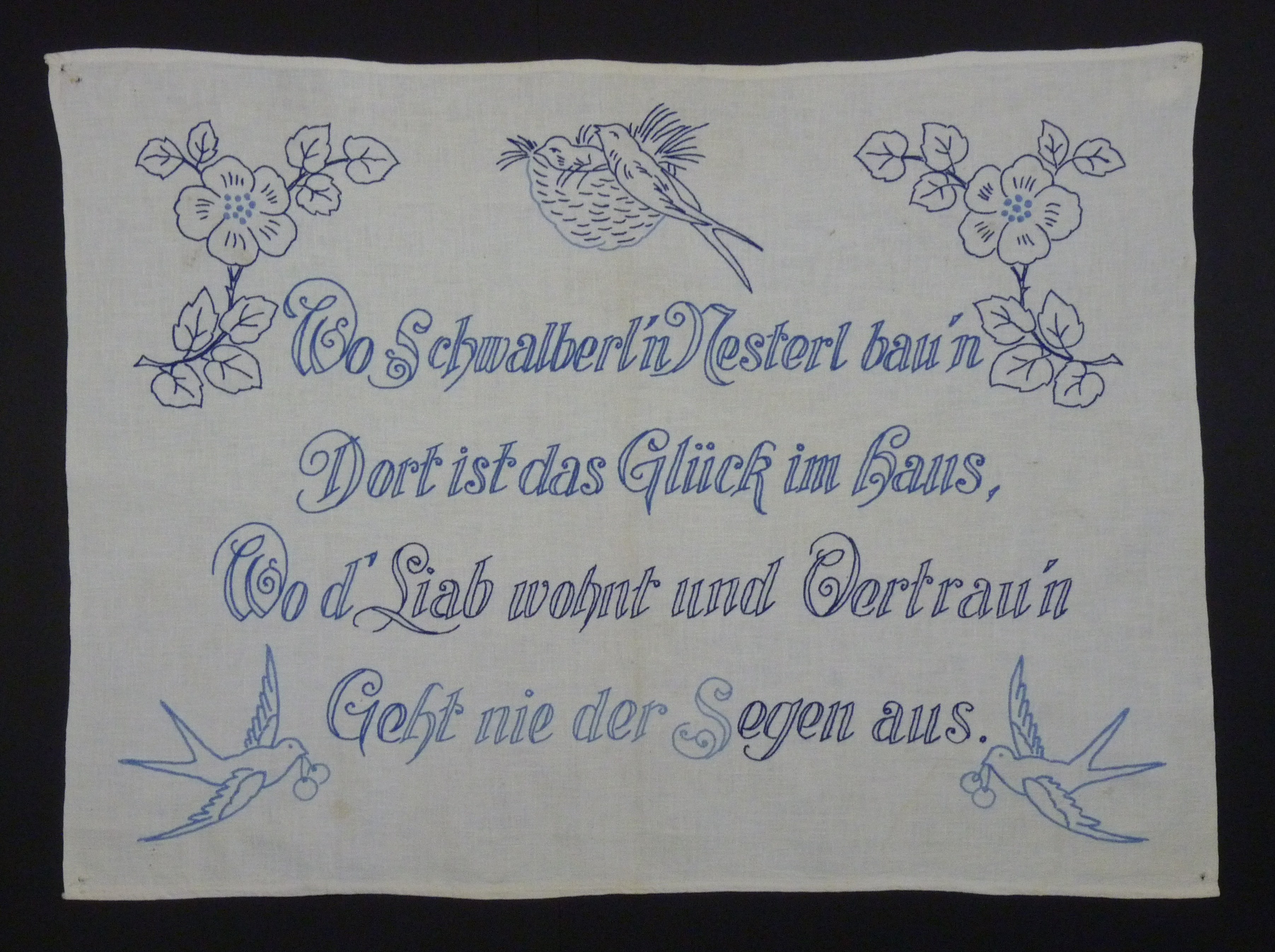 Spruch:"Wo Schwalberl'n Nesterl bau'n / Dort ist das Glück im haus, / wo d' Liab wohnt und Vertrau'n / Geht nie der Segen aus. /"