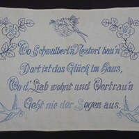 mit zwei Blautönen bestickt; in den Ecken Löcher vom Aufhängen; Motiv: Vögel und Blumen;