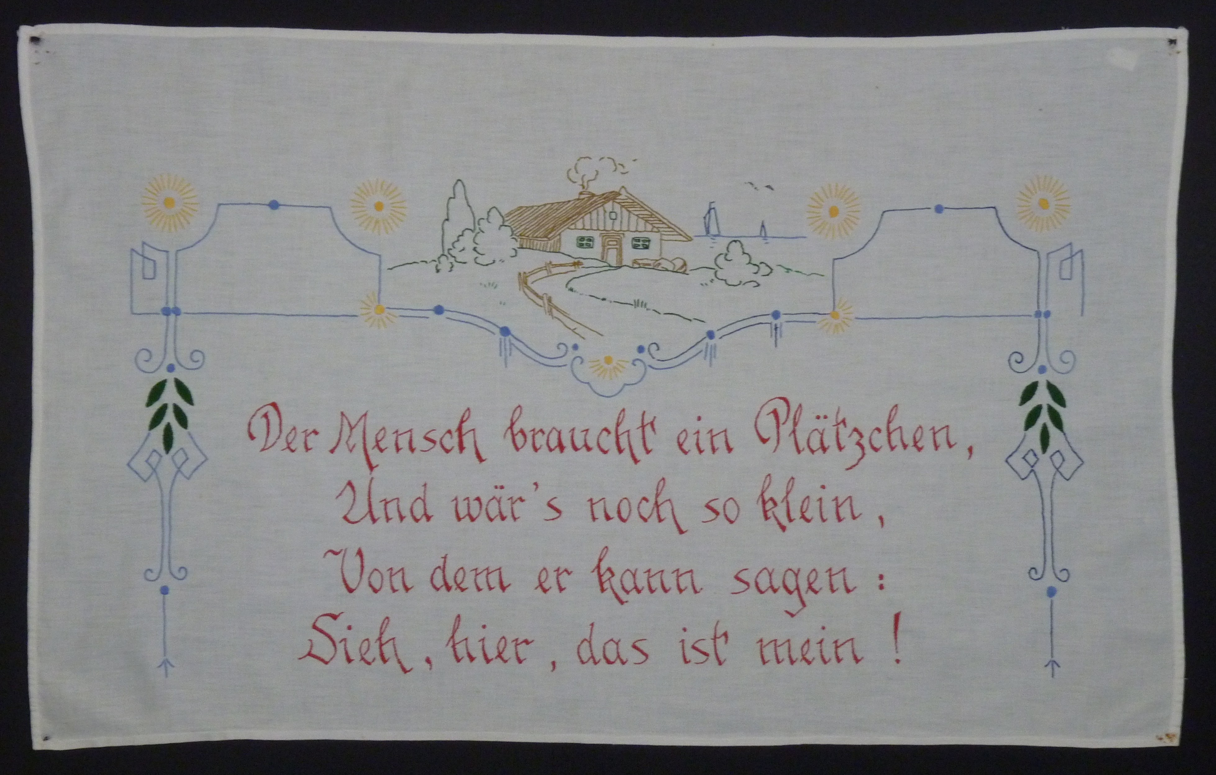 Spruch: "Der Mensch braucht ein Plätzchen, / Und wär's noch so klein, / Von dem er kann sagen: / Sieh, hier, das ist mein!"