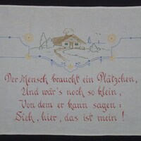 Spruch rot gestickt, Motiv in braun, blau, grün, gelb; Plattstich, Stielstich; Motiv: Landschaft mit Bauernhaus, Ornamente;