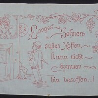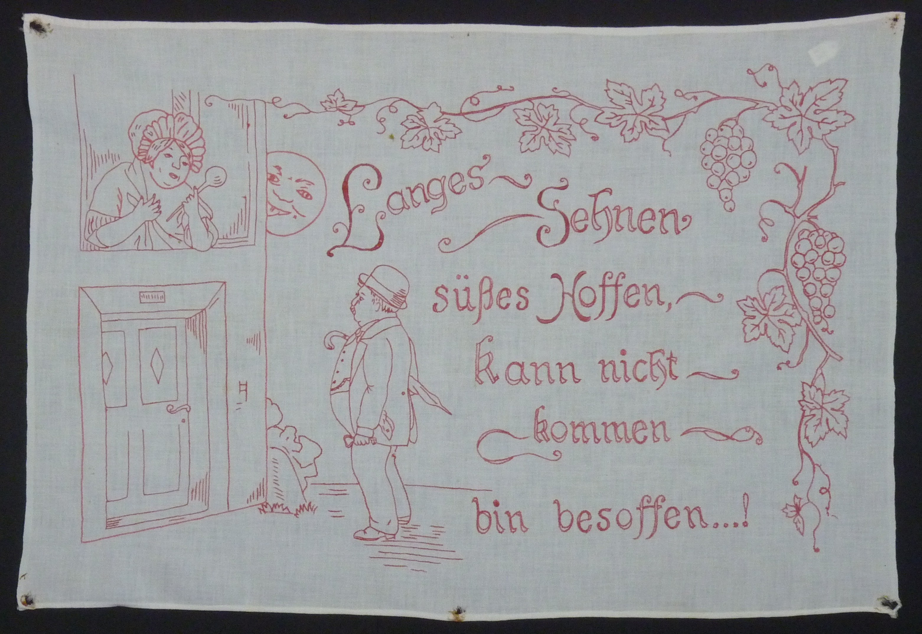 rot bestickt; Motiv: Weinranken, Mann steht vor dem Fenster einer Frau mit Kochlöffel;