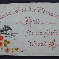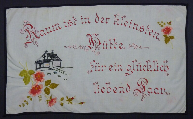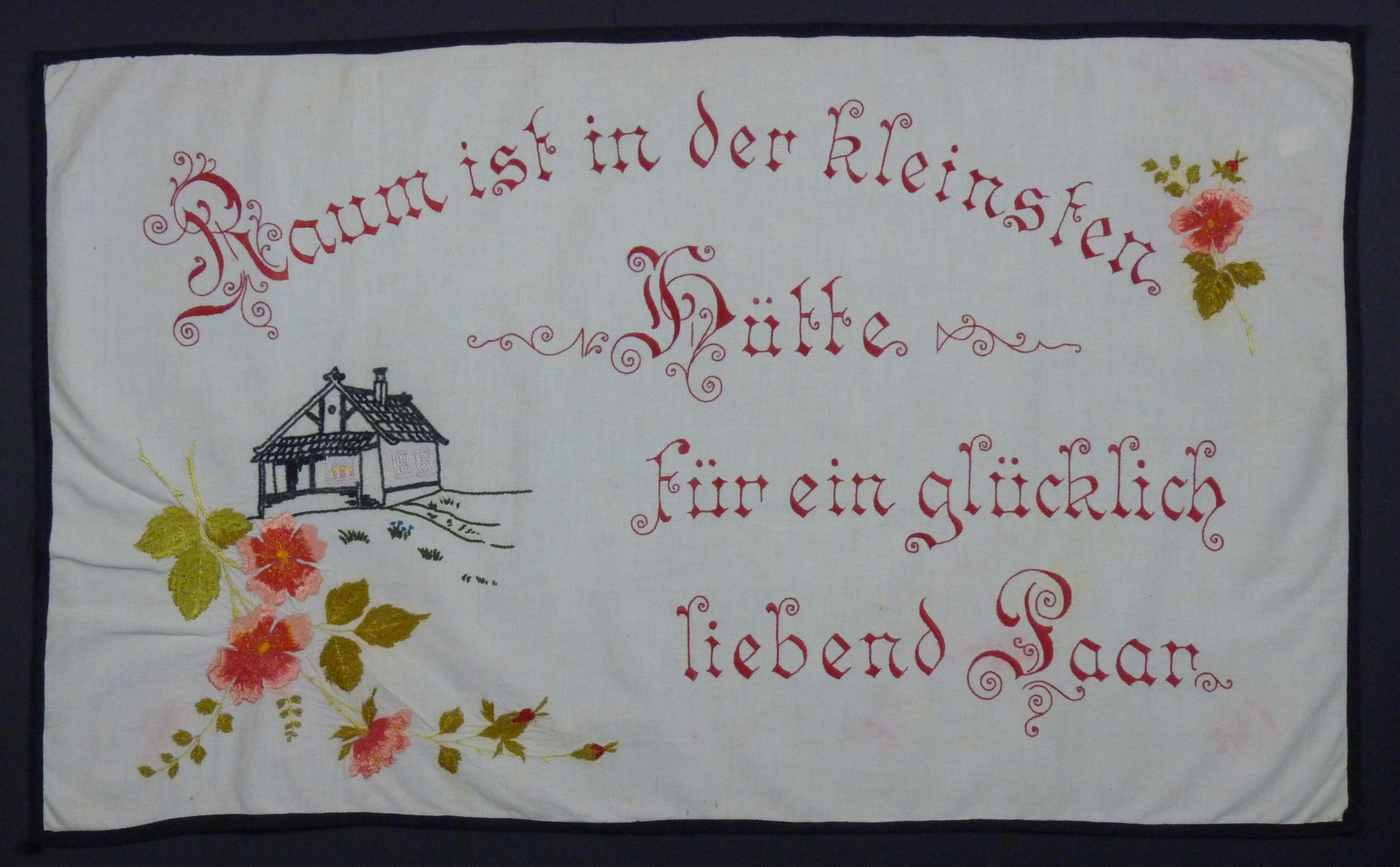 Spruch rot gestickt; mit einem schwarzen Band eingefasst; Motiv: Hütte mit Blumen "gefludert";