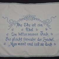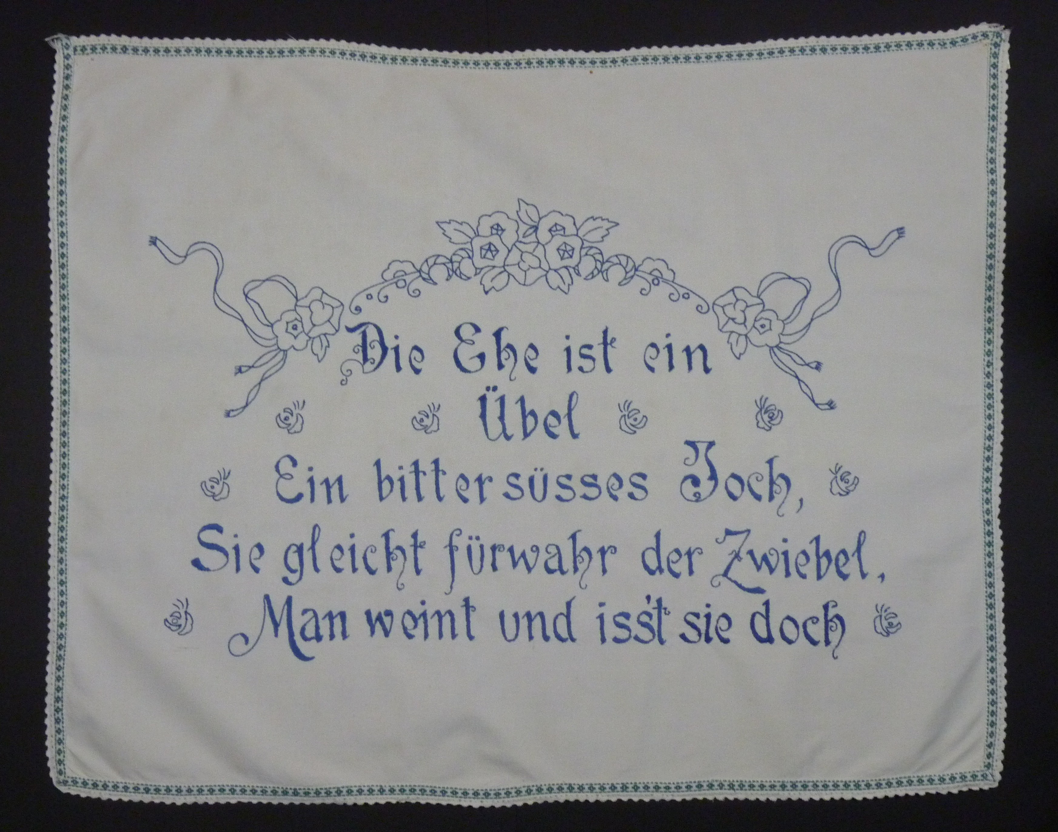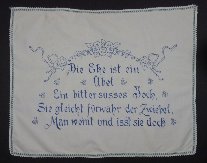 Spruch: "Die Ehe ist ein / Übel / Ein bitter süsses Joch, / Sie gleicht fürwahr der Zwiebel, / Man weint und isst sie doch" - Umfang