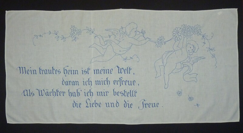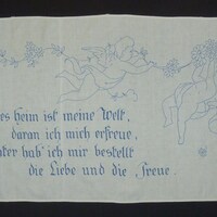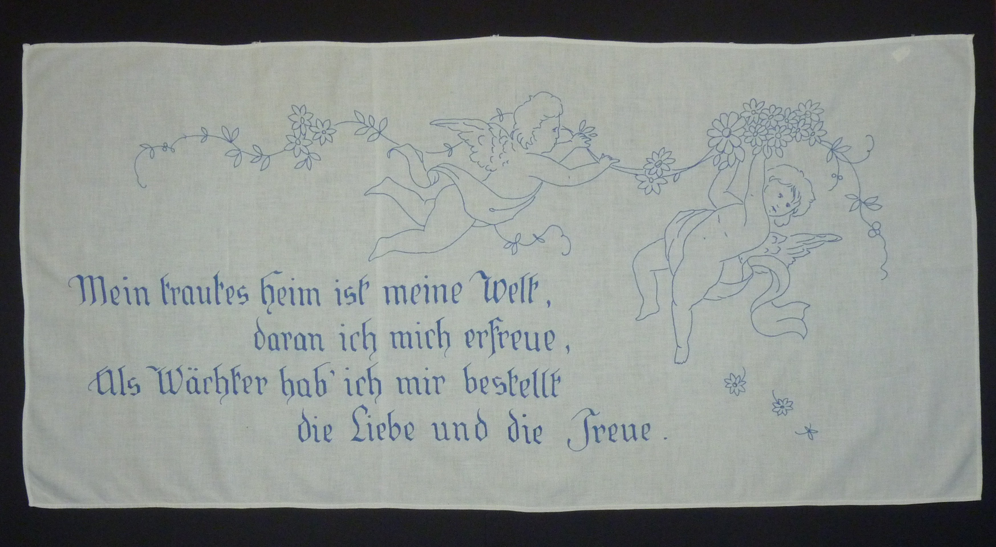 blau bestickt; Plattstich, Stielstich; am oberen Rand drei Laschen zum Aufhängen; Motiv: zwei Engel, Blumenranken;