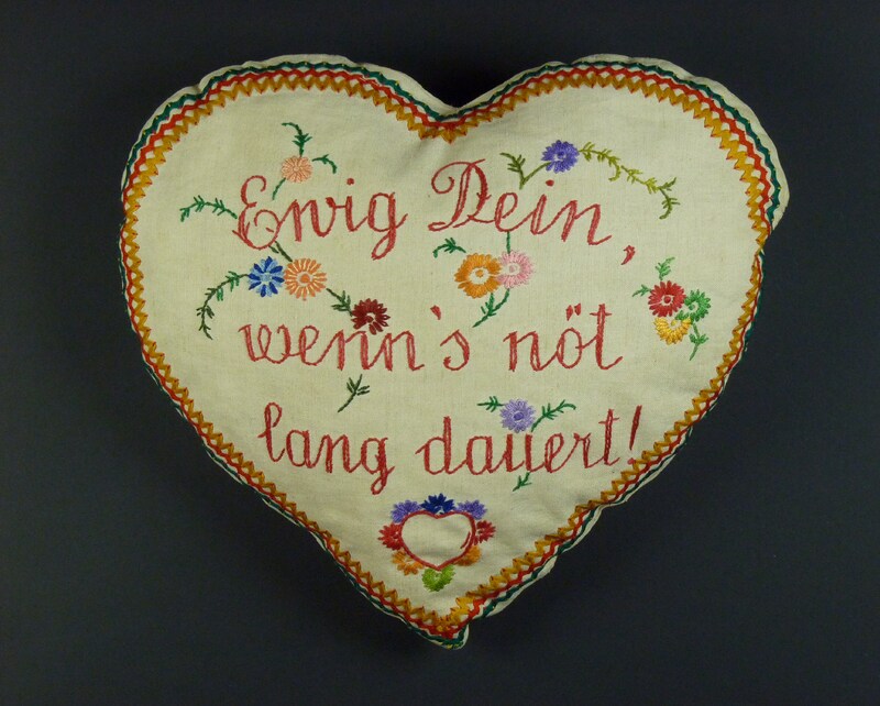 bunt bestickt; herzförmig; Motiv: Blumen;