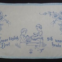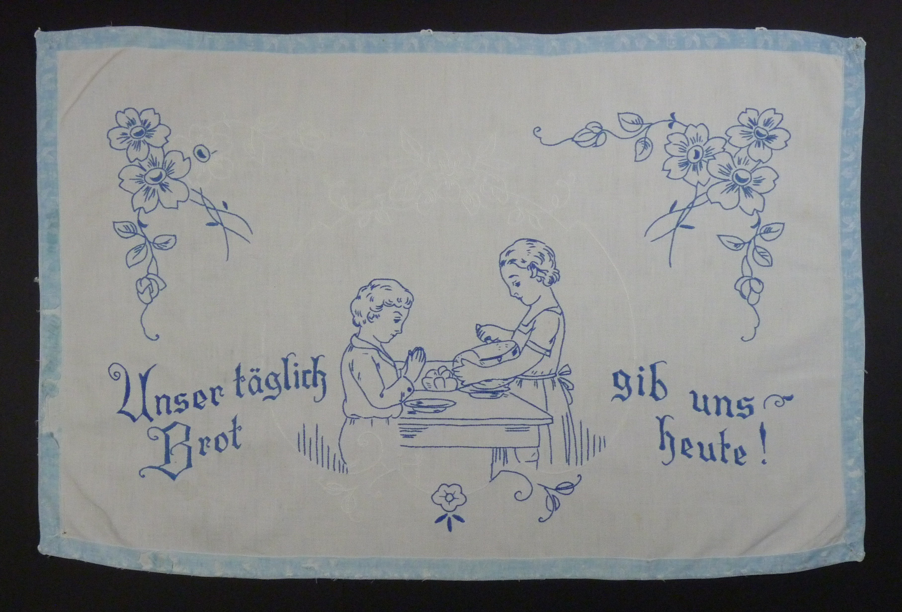 Stielstich in blau und weiß; Blumengirlande mit hellblauem Textilband eingefasst; Motiv: betender Junge, mit jungem Mädchen am Tisch;