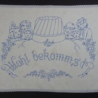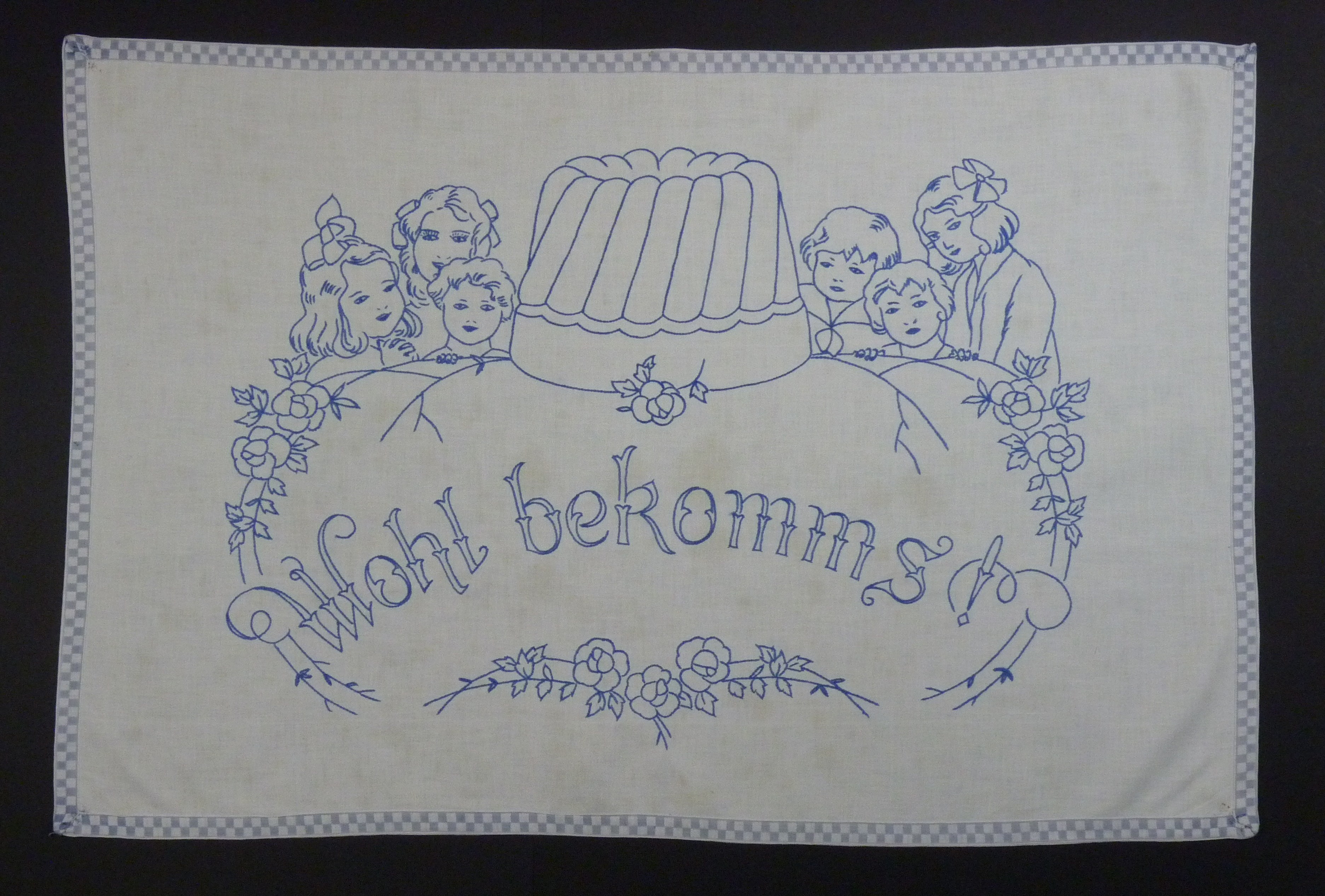 blau bestickt; Stielstich; mit Zierband eingefasst; Motiv: Mutter mit 5 Kindern und Gugelhupfform;