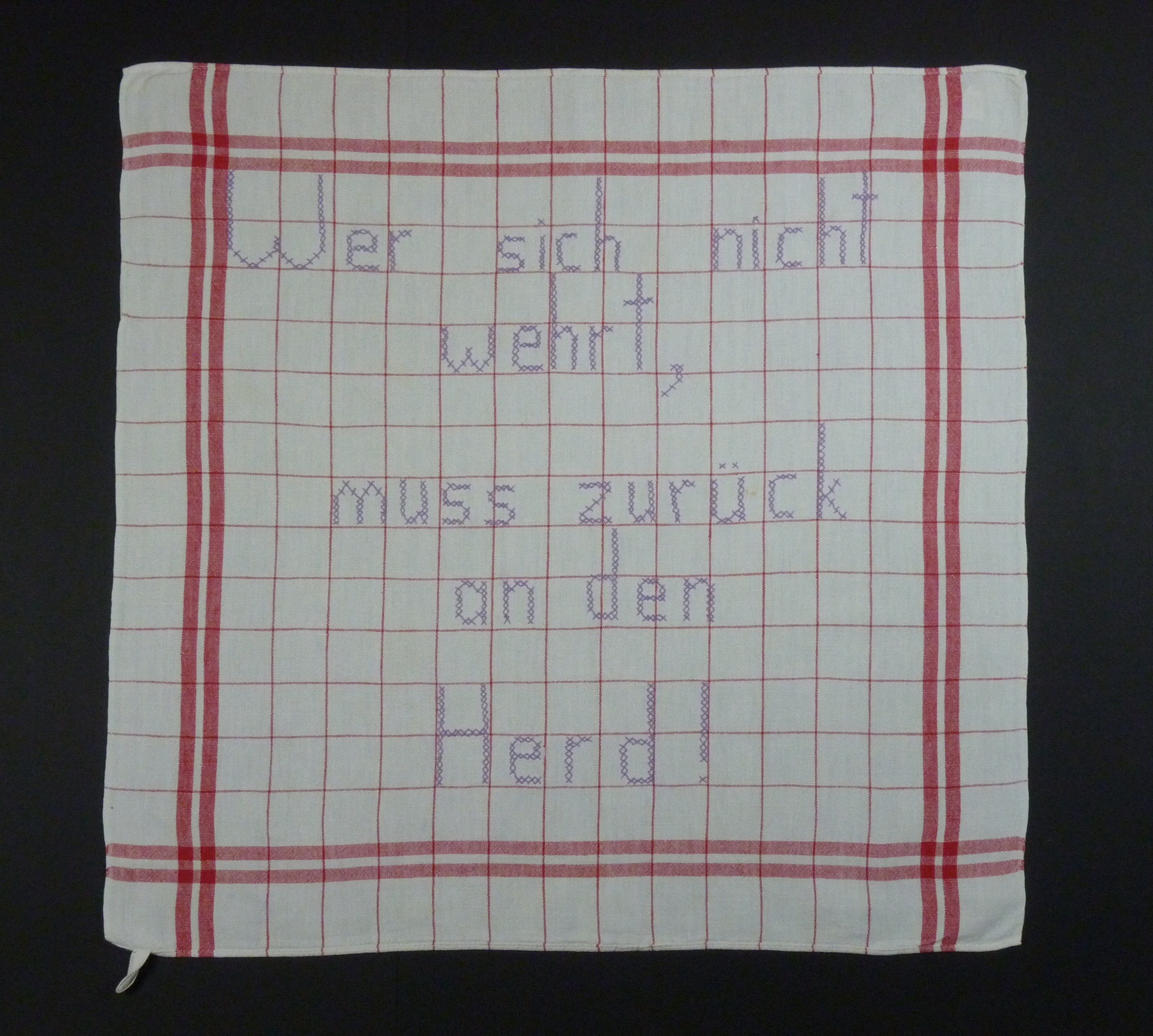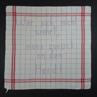 Spruch: "Wer sich nicht / wehrt, / muss zurück / an den / Herd!" - Umfang