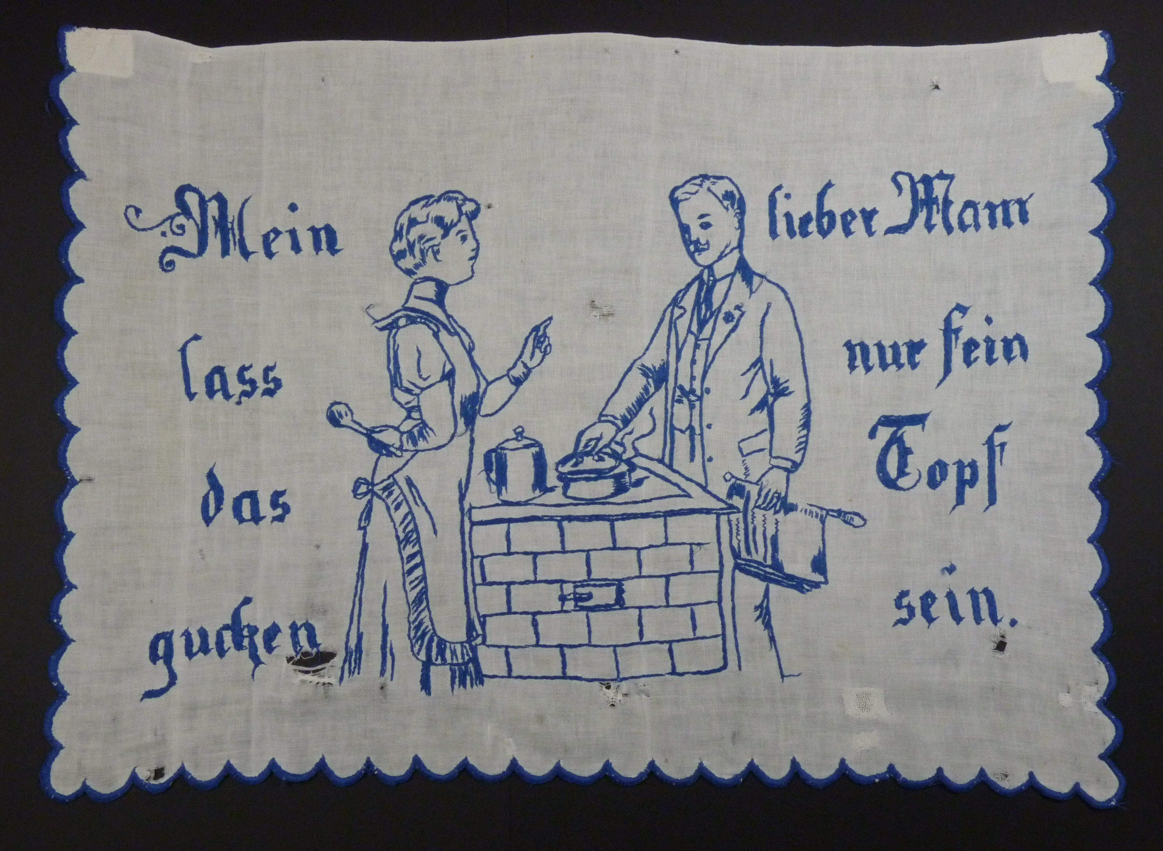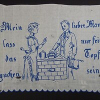 blau bestickt; blaue Umrandung; rechts, links und unten mit Schlingstich eingefasst; Motiv: Frau am Herd, Mann mit Zeitung;