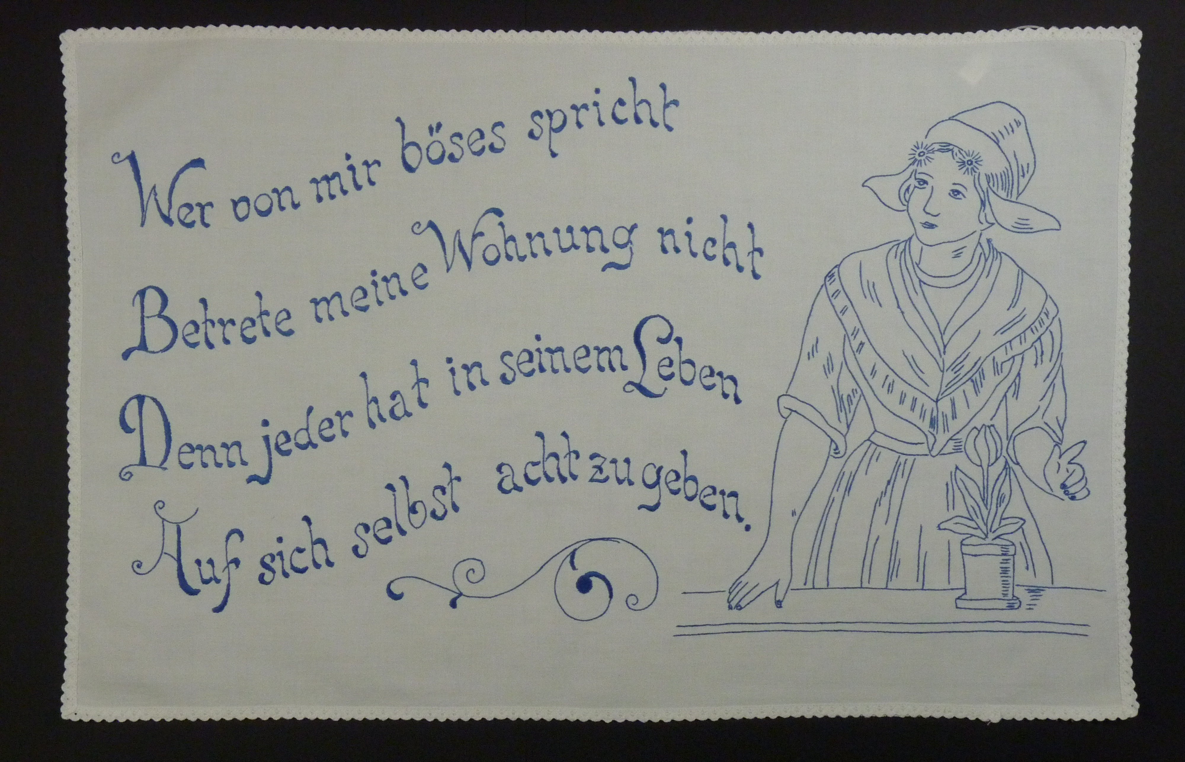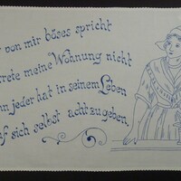 Spruch: "Wer von mir böses spricht / Betrete meine Wohnung nicht / Denn jeder hat in seinem Leben / Auf sich selbst acht zu geben. " - Umfang