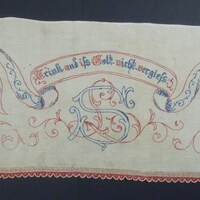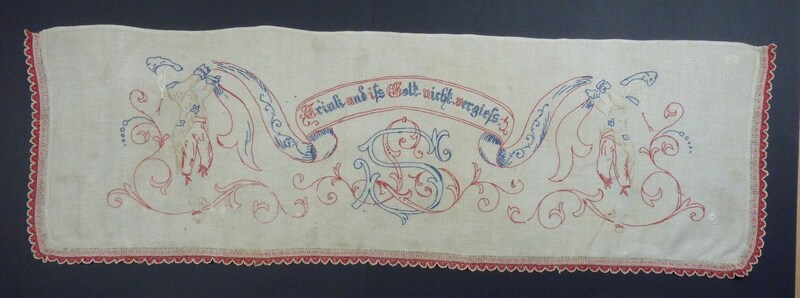 bestickt in rot, blau, braun, weiß; rechts, links und unten eingefasst mit sehr feiner Häkelspitze und gestickten Blümchen; Motiv: zwei Herren in Bundhosen und Frack, schwingen eine Schleife, Girlanden;