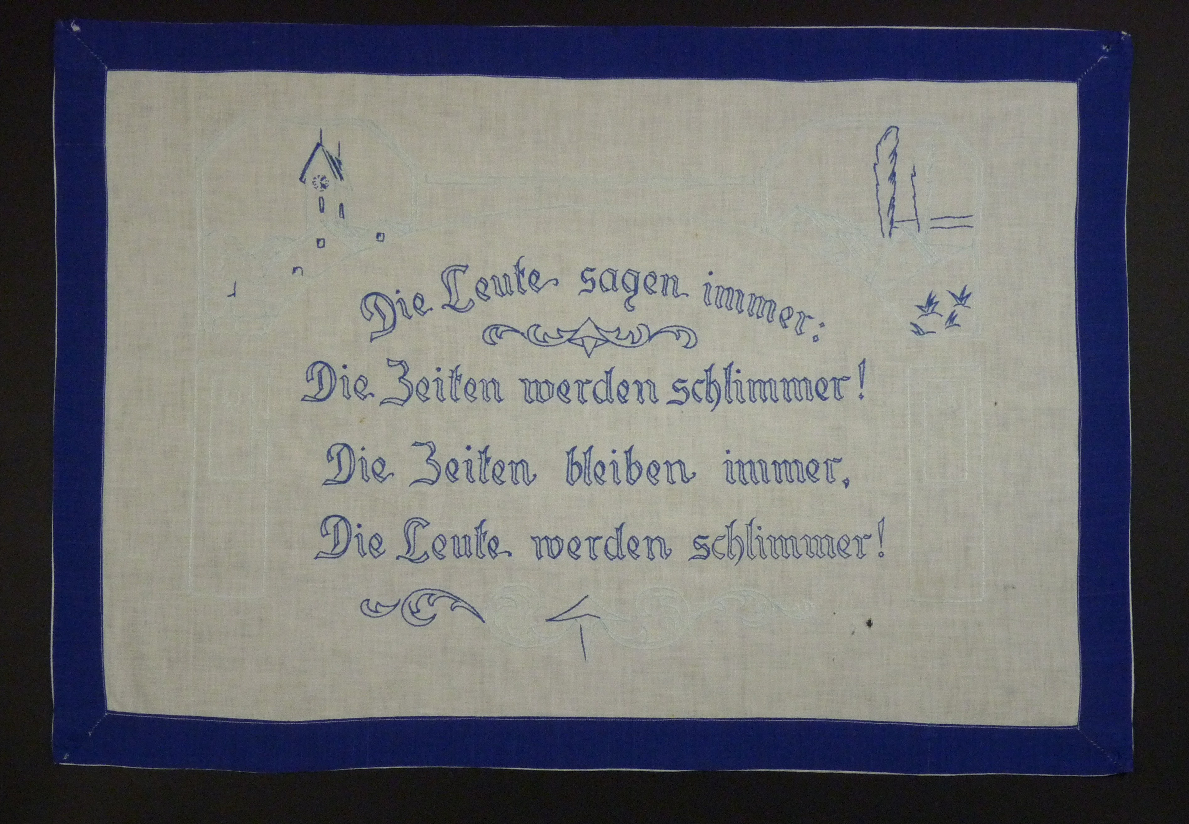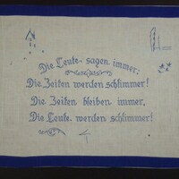 Spruch: "Die Leute sagen immer: / Die Zeiten werden schlimmer! / Die Zeiten bleiben immer, / Die Leute werden schlimmer!" - Umfang