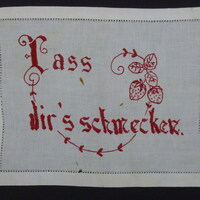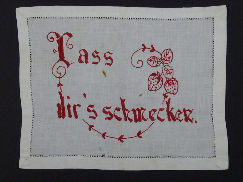 rot bestickt; Platt- und Stielstich; mit Hohlsaum; Erdbeermotiv;