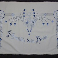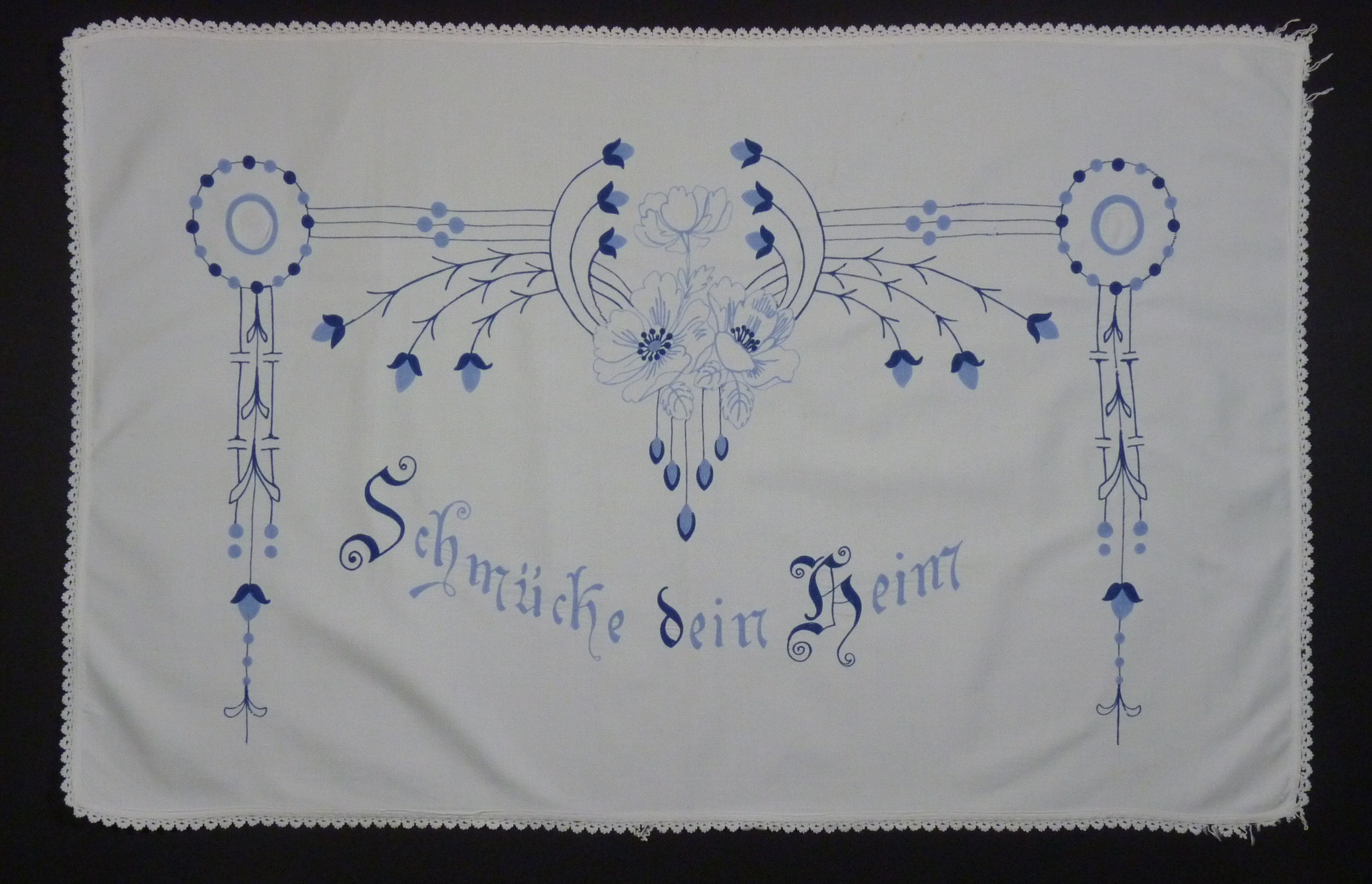 hell- und dunkelblau bestickt; Kettenstich; mit weißer Spitze eingefasst; Motiv: Blumengirlande;